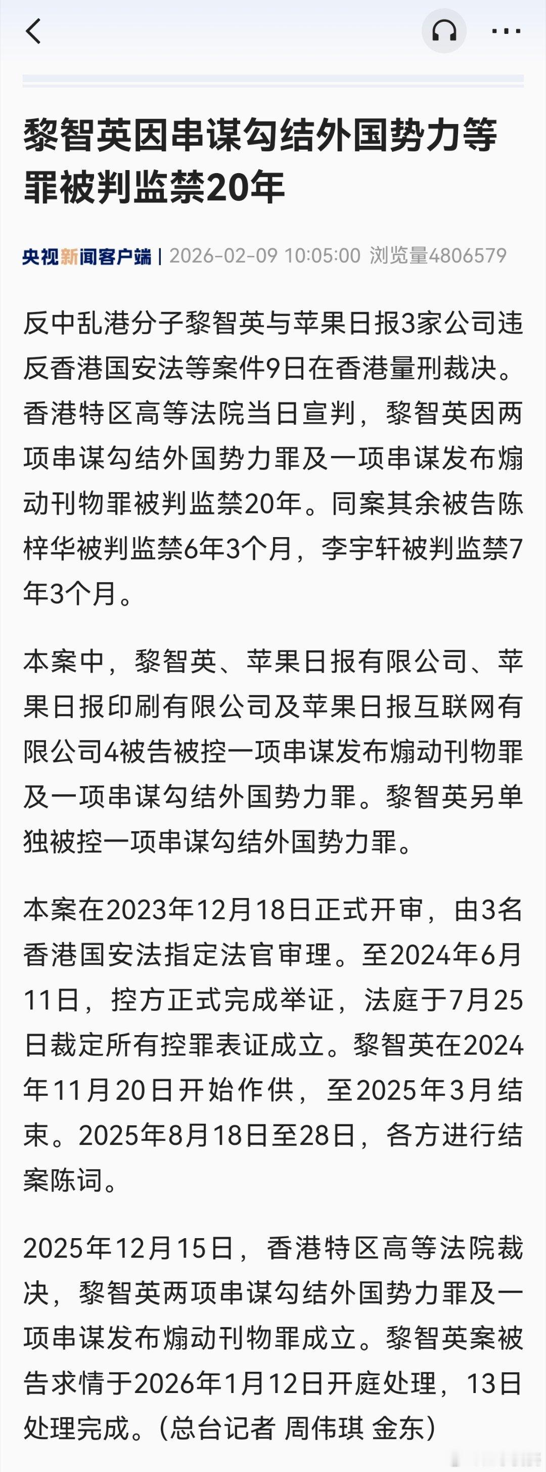 黎智英被判20年黎智英因串谋勾结外国势力等罪被判监禁20年(来源:央视新闻客户端
