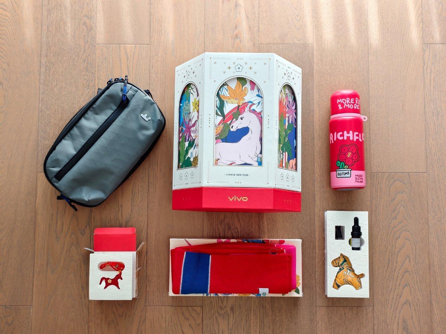 收到了vivo的新年礼物,有红色水杯、羊毛围巾、斜挎包、新年红包、车载香薰、小马挂坠,超级实用。最近快递的原因,抽奖先临时暂停,不过我准备了一桌子的奖品年后抽奖给大家