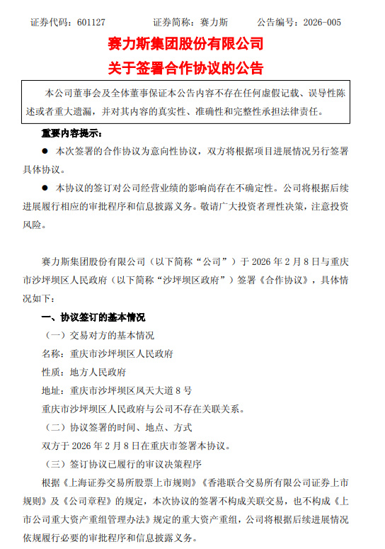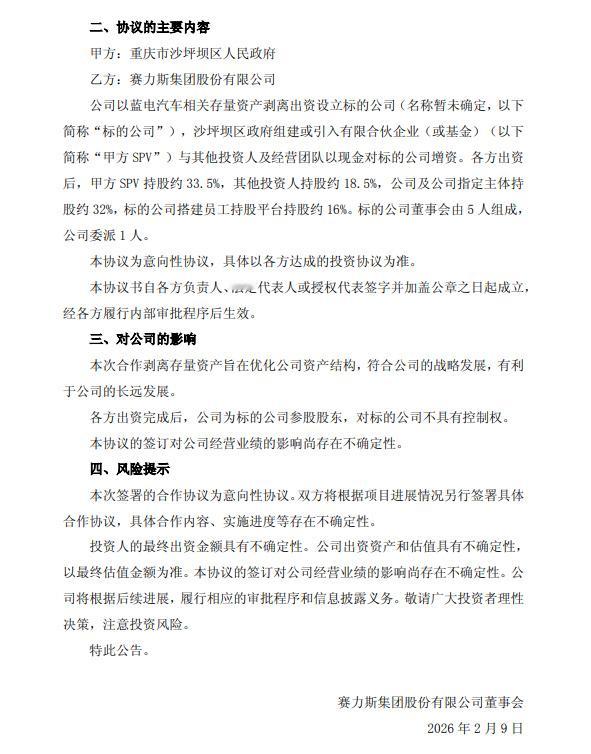 赛力斯拟剥离蓝电汽车资产 2月9日,赛力斯(601127)发布公告称,公司于2月8日与重庆市沙坪坝区人民政府(简称“沙坪坝区政府”)签署《合作协议》。公司以蓝电汽车相关存量资产剥离出资设立标的公司(名称暂未确定,简称“标的公司”),沙坪坝区政府组建或引入有限合伙企业(或基金)(简称“甲方SPV”)与其他投资人及经营团队以现金对标的公司增资。各方出资后,甲方SPV持股约33.5%,其他投资人持股约18.5%,公司及公司指定主体持股约32%,标的公司搭建员工持股平台持股约16%。标的公司董事会由5人组成,公司委派1人。