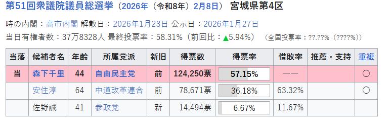 写真女郎击败了立宪民主党的二号人物、干事长安住淳顺利当选!森下千里,1981年9月出生,现为自由民主党籍众议院议员(宫城县第4区),高市内阁的环境大臣政务官。她曾是知名写真偶像、模特儿、演员。 安住淳,1962年1月出生,10届日本众议院议员。曾任野田内阁财务大臣,立宪民主党干事长。