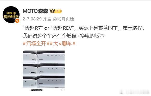 “博越R7” or “博越REV”,实际上是睿蓝的车,属于增程,我记得这个车还有