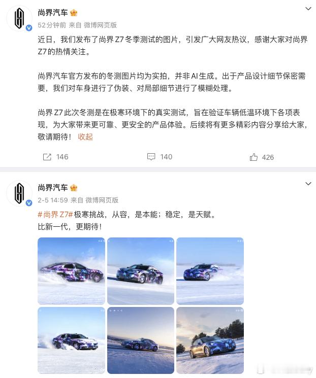 尚界汽车辟谣冬测图片为AI生成今日,尚界汽车发文表示,尚界汽车官方发布的Z7冬测图片均为实拍,并非AI生成。“出于产品设计细节保密需要,我们对车身进行了伪装、对局部细节进行了模糊处理。”