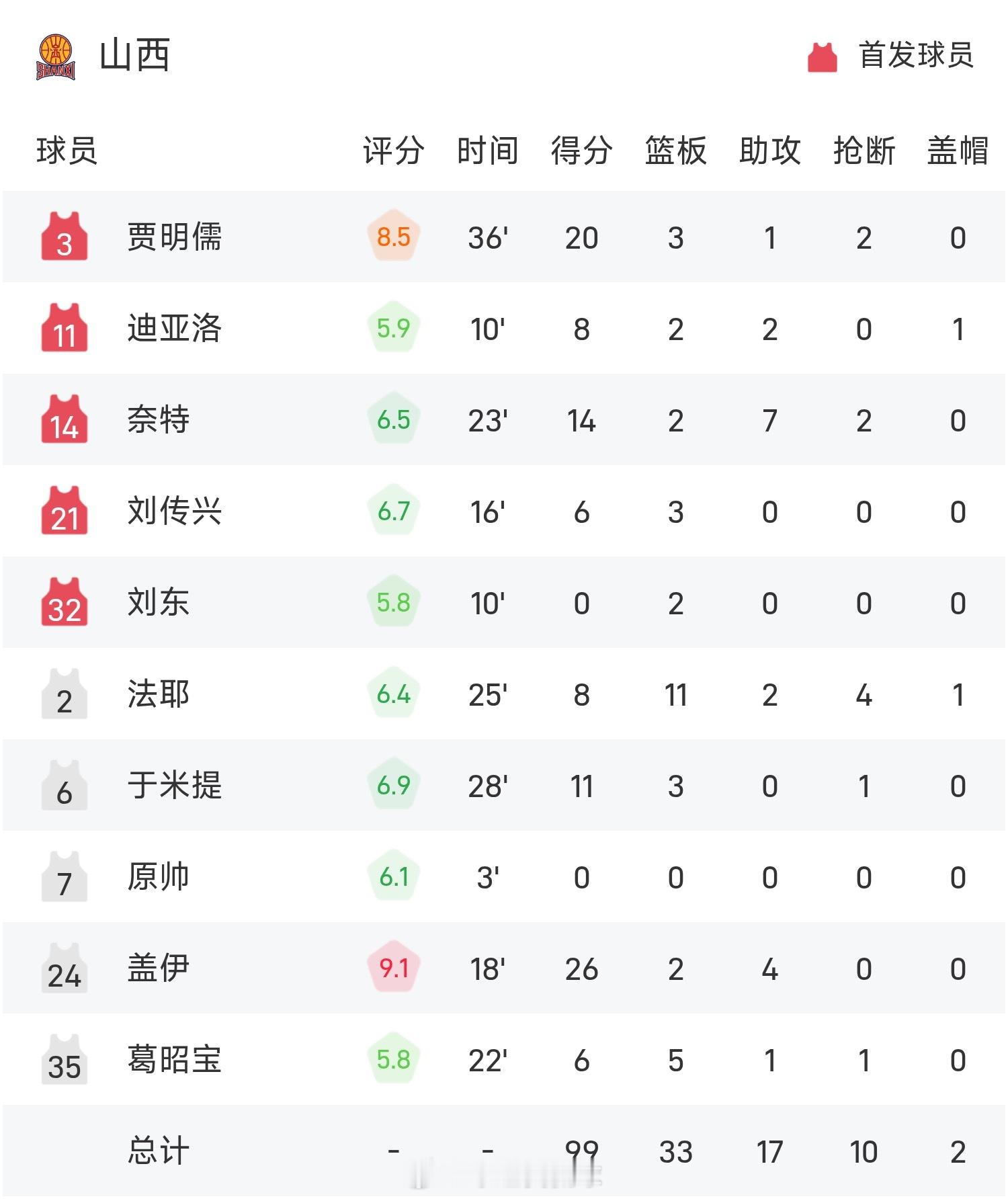 盖伊砍下全场最高的26分2板4助,率领山西成功取胜。CBA