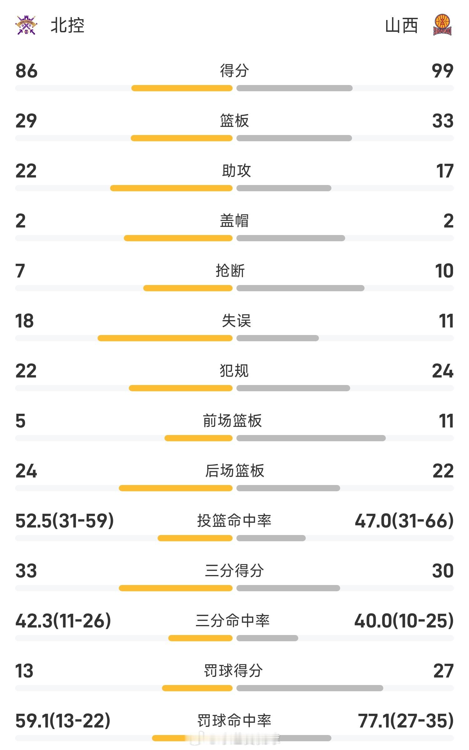 双方全场战罢,山西99-86战胜北控。