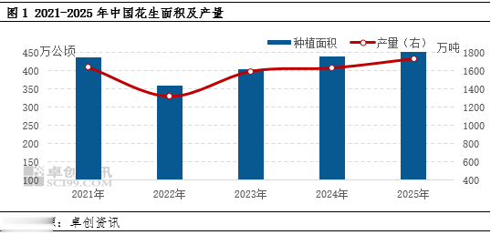 花生是我国主要经济作物之一,在黄淮海、东北以及部分南方地区有广泛的种植基础。从历年中央一号文件的内容不难看出,发展花生产业对我国粮油生产的稳定以及自给能力有重要意义。近5年,中国花生整体供应处于恢复增长状态,产量复合增速约1.11%。2022年,受部分地区干旱及上一季花生采收成本上升等因素影响,中国花生播种面积显著下滑,进而导致全年产量同比减少。受供应缩减提振,2022年花生市场价格达到近10年来的第二高点,一定程度上刺激了产区播种积极性,2023年至2025年新花生面积延续增长态势。2025产季,各产区之间播种面积互有增减,生长期东北及河北整体天气影响不大,丰产为主。河南及山东先旱后涝影响部分品质及单产。卓创资讯对重点产区播种面积调研结果进行加权平均后,测算2025产季新花生整体播种面积增加3.89%至456.96万公顷,产量预估约1734.17万吨,同比回升6.20%。东北、河北产区丰收,河南有产量无品质,次货与好货价差扩大。