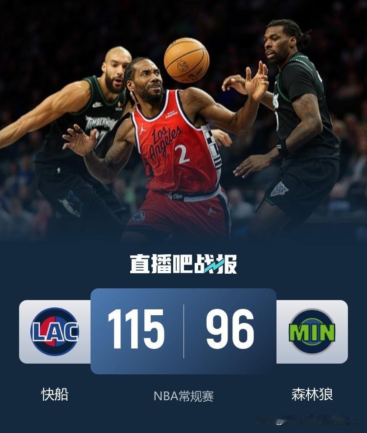 NBA常规赛继续进行,快船客场115:96轻取森林狼,莱昂纳德轰下41分8篮板4抢断,尼德豪泽、科林斯分别拿到15分;森林狼这边爱德华兹空砍23分,兰德尔拿到17分8篮板,海兰德、戈贝尔分别拿到10分,最终森林狼主场不敌快船,恭喜快船队取得本场比赛胜利! 洛杉矶快船