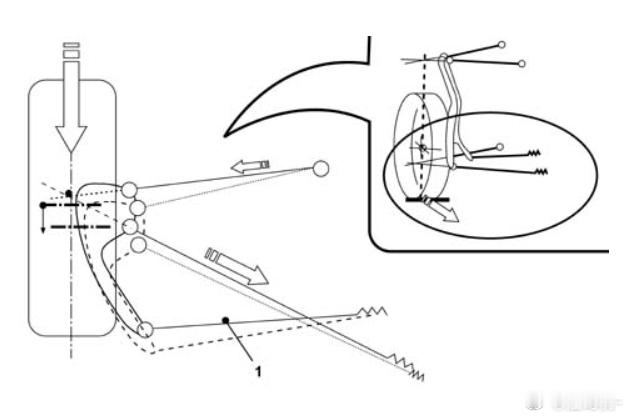 说说下摆臂解耦的另一面:图1所示,一个A臂用两个球头,解耦成两根连杆,延长线交汇成虚铰,形成虚拟主销。