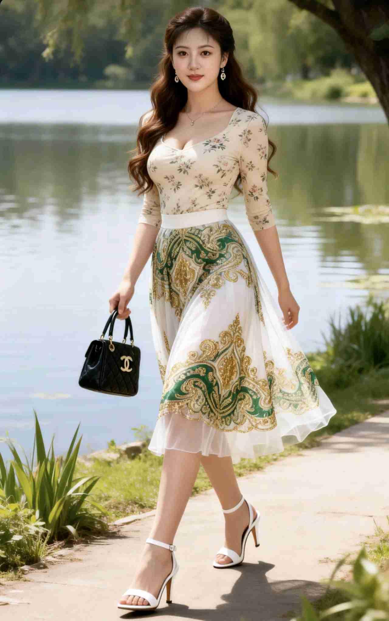 我的今日状态:😁轻松愉快 我这里的天气:☀️晴天 《湖畔轻步》 柳丝垂落,吻过湖面的涟漪, 她的裙裾,也漾着金绿的诗意。 碎花上衣,藏着初夏的呼吸, 薄纱裙摆,轻扫过石板的凉意。 香包在腕间轻晃, 像一颗被时光珍藏的星芒。 白鞋踏碎了光影, 每一步,都踩在风的心上。 湖水静得像一面镜子, 映着她眼底的温柔与从容。 不必追赶,不必慌张, 此刻,她就是风景本身。