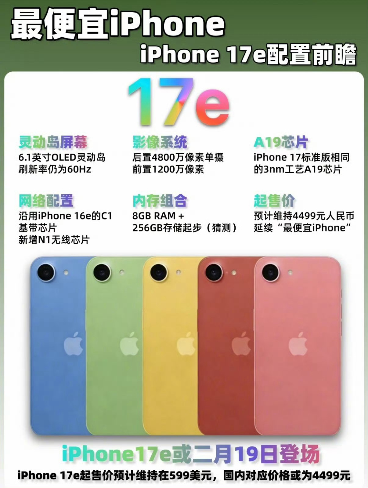 iPhone 17e即将发布,取代iPhone 16e。号称目前苹果最便宜的新手机,国行是4499元,在国补之后仅需3999元。