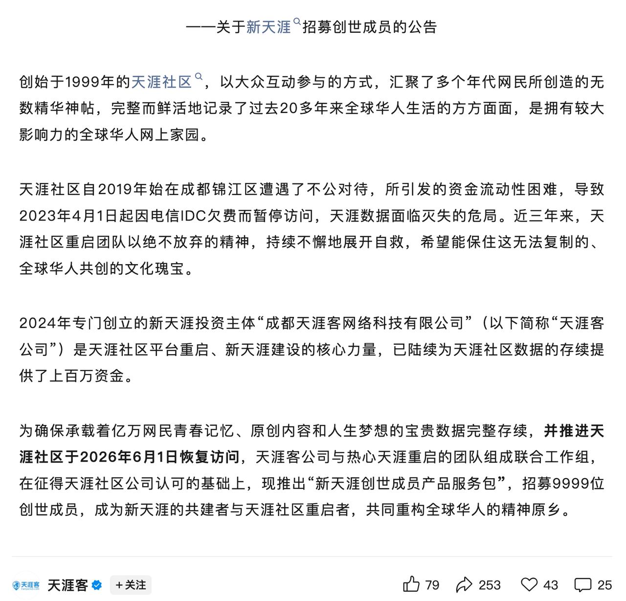 天涯社区关停近3年后宣布重启,计划6月1日恢复访问。不过,这只是计划而已,能否顺利推进取决于新天涯创世成员招募情况,其有意招募9999名创世成员,每人需支付1999元。资金到位后,新天涯将启动线上线下相融合的天涯客网络平台、恢复天涯社区访问、基于WEB3.0平台的海外天涯。总之,天涯的重启和共建八字还没一撇,仍存在诸多变数。退一万步来讲,就算天涯如期在6月1日恢复访问,自带情怀的用户尝鲜过后还有多少留存率,恐怕高不到哪里去!
