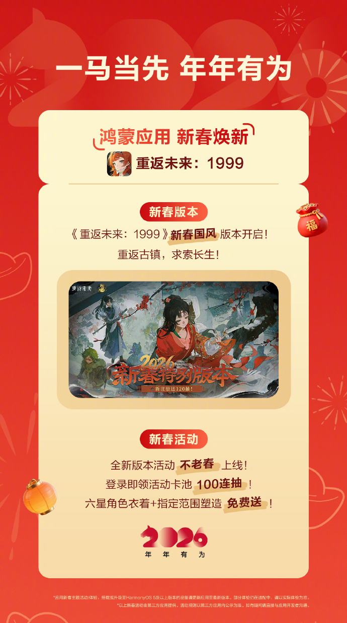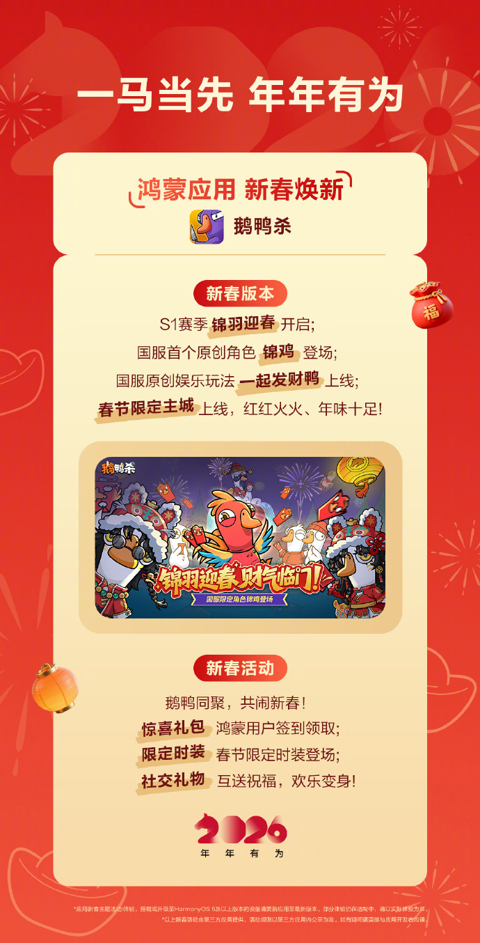 马上过年了,鸿蒙应用也“马”上升级更新了一波!发红包想玩点新花样?快来试试碰一碰发红包,简直是为春节量身定做的!一家人坐在一块,用支付宝“碰一碰”就能领红包领完红包,还可以一起玩鹅鸭杀,来上一把刺激的真心换真心。自己一个人想放松时,暗区突围、重返未来:1999等各种游戏都可以畅玩,过年宅家打游戏再也不怕卡顿扫兴。从《植物大战僵尸3》到《开心消消乐》,从《攻城掠地》到《我的花园世界》,鸿蒙应用让春节的娱乐选择更多样化了而且从拜年社交到聚会娱乐,很多应用都接入了鸿蒙独有的便捷特性,让过年不仅有浓浓的传统年味,还多了不少新鲜感!鸿运马上来