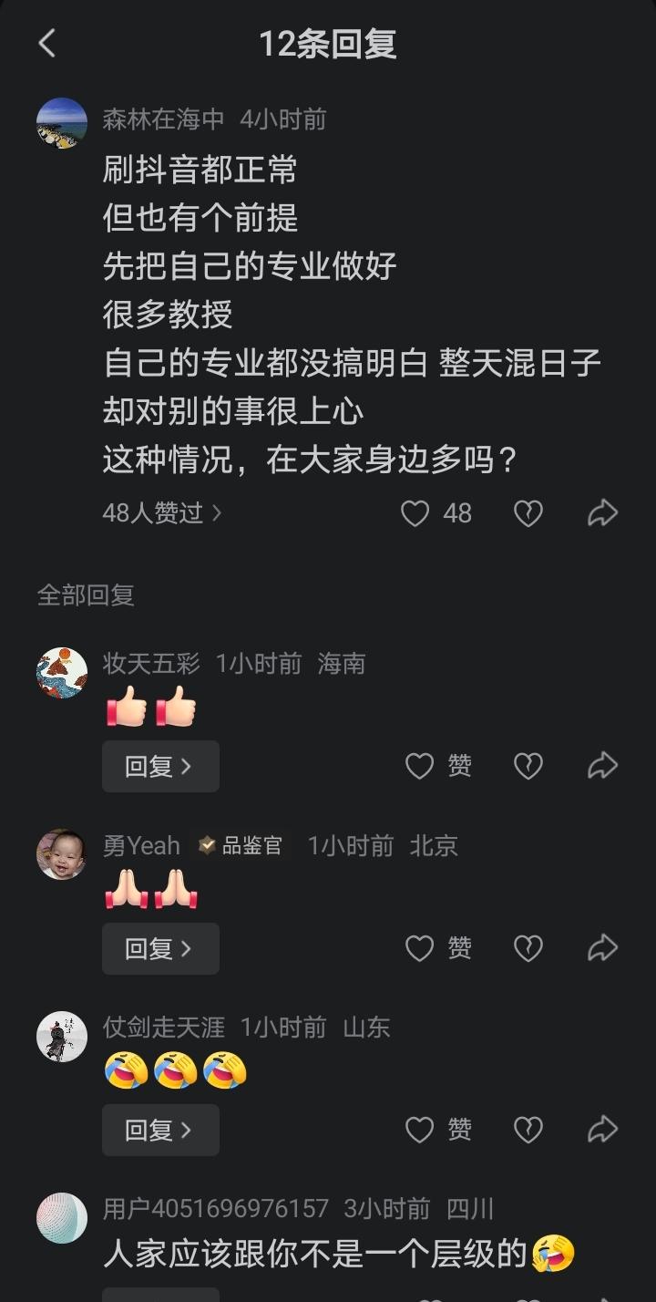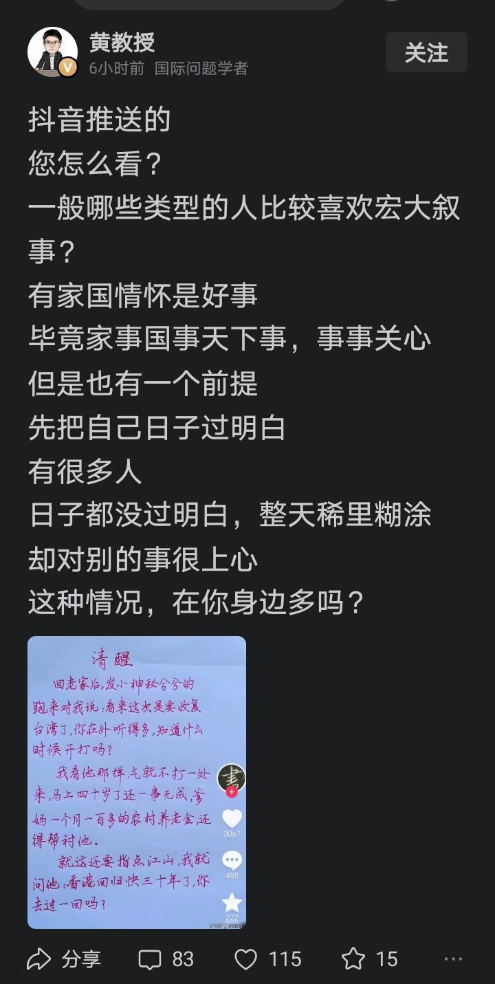 果然头条评论区比正文精彩,黄教授这下多少有点尴尬吧!评论区网友模仿他的文风问“这种情况,在大家身边多吗? 暂时未见黄教授如何回复该网友,不过其他网友已经把这条评论顶到第一了。 事情的起因是黄教授引用另外一位网友的帖子,想试图说明一个人如果连自己的生活都过不好,那就不要关心所谓的国家大事了! 有网友看不惯某种高高在上的说教,于是就模仿他的口吻回复:教授刷抖音很正常,“但也有个前提先把自己的专业做好,很多教授自己的专业都没搞明白整天混日子,却对别的事很上心。这种情况,在大家身边多吗?” 这条评论多少获赞48个,还有12条评论,黄教授正文总共才获赞110多个,由此可见有不少网友并不认同教授的说辞。 对此我的看法是,穷人哪怕是乞丐,他谈论国家大事也无妨,这只不过是茶余饭后的正常情绪渲泄有何不可?难道只有像黄教授、老胡、易中天等专家学者才配指点江山,激扬文字?流浪的沈巍在街头论文墨,去博物馆点评文物就不行了? 王侯将相宁有种乎?明朝开局一只破碗,不也延绵两三百年,威震四海! 所以,虽说今时不同往日,但是向上翻三代,现今多少所谓的精英,其父辈、祖辈不是泥腿子、穷苦人出身呢?如果他们当时也不敢或不能谈论所谓的“宏大叙事”,今天能有你们坐在空调房高高在上说风凉话的好日子过吗? 做人不能忘本,为师者格局更要打开!孔老夫子都有向小孩请教的时候,更何况是后辈读书人!