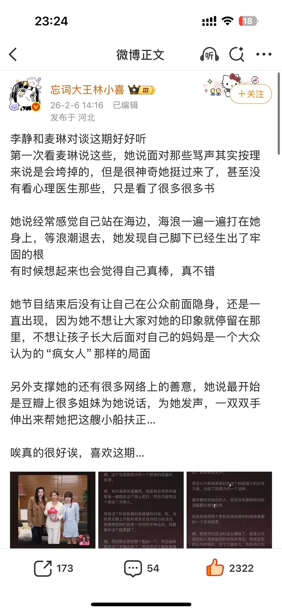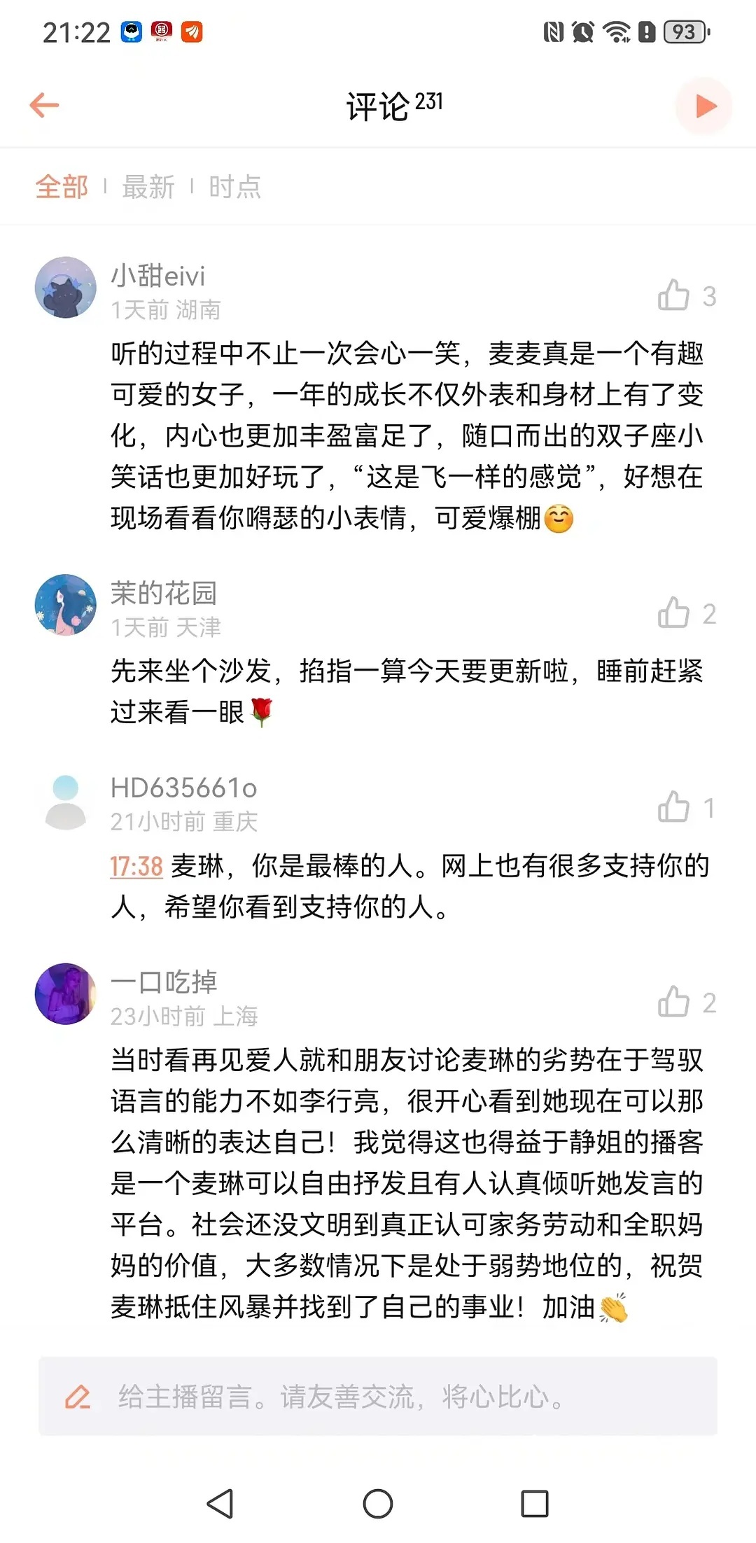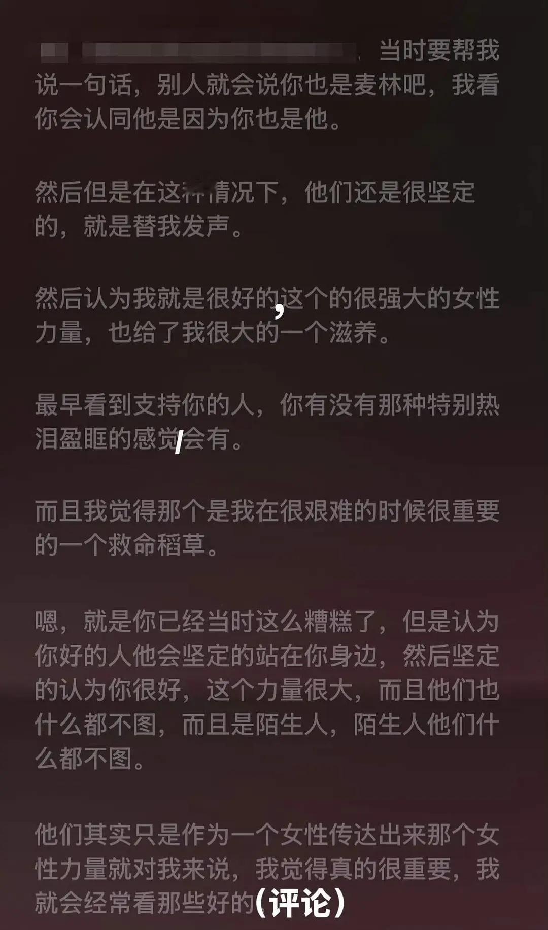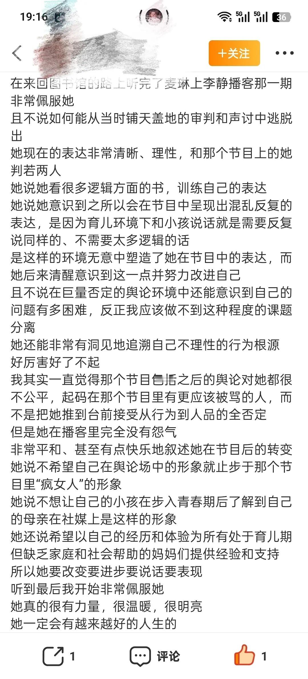 麦琳 是什么都不图的陌生女性救了我想起当时刘乐上鲁豫播客,大家都说应该请麦琳,现在麦麦真的上了李静的播客!麦麦再次感谢当时顶着网暴帮她说话的女性朋友,她说没有当时帮她说话的姐妹,自己这个小船早就翻了,是一双双汹涌海浪里伸出的手,让她这艘小船可以继续航行…希望每个遭受误解恶剪和网暴的女孩,都能有麦麦的坚韧和勇气,也有麦麦的幸运,可以得到这么多女性善意的帮助