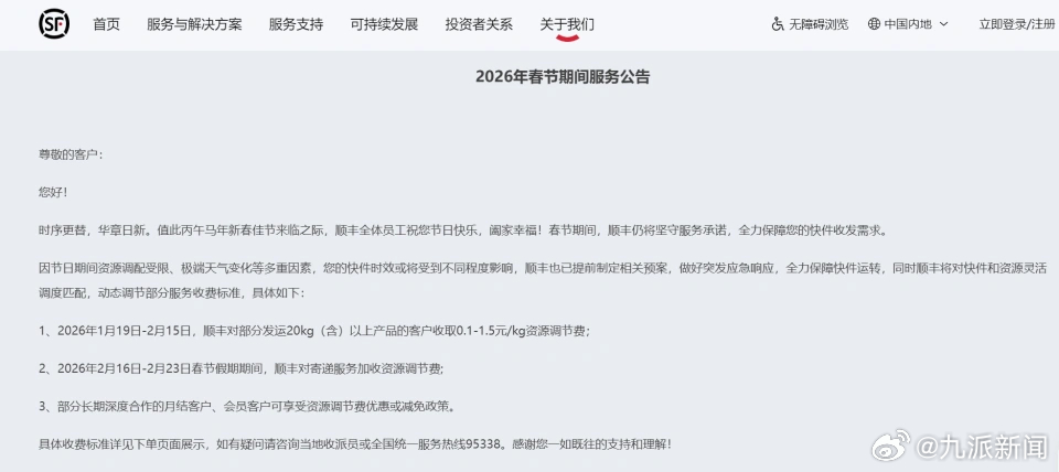 比如顺丰快递发布公告称,春节期间,顺丰仍将坚守服务承诺,全力保障您的快件收发需求。同时顺丰将对快件和资源灵活调度匹配,动态调节部分服务收费标准,具体为:2026年1月19日-2月15日,顺丰对部分发运20kg(含)以上产品的客户收取0.1-1.5元/kg资源调节费;2026年2月16日-2月23日春节假期期间,顺丰对寄递服务加收资源调节费。