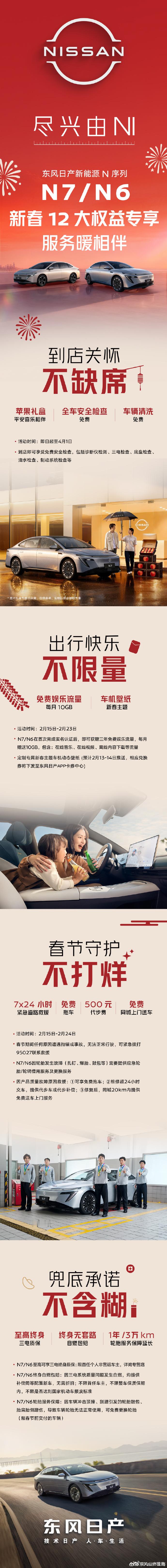 东风日产N系列12大新春权益暖心上线2月9日,发布,东风日产新能源N7、N6收获6万车主信赖,新春推出12大专属权益。涵盖全车免费检测、免费洗车、苹果礼盒、三年娱乐流量、7×24小时春节救援等,覆盖出行刚需。未购车用户可享夜间试驾、低息贷款与政企补贴,以实在服务回馈用户,祝车主新春平安顺遂。春节返乡神车N6东风日产n69万级高颜值超舒适插混N6新年开大紫大红大N6