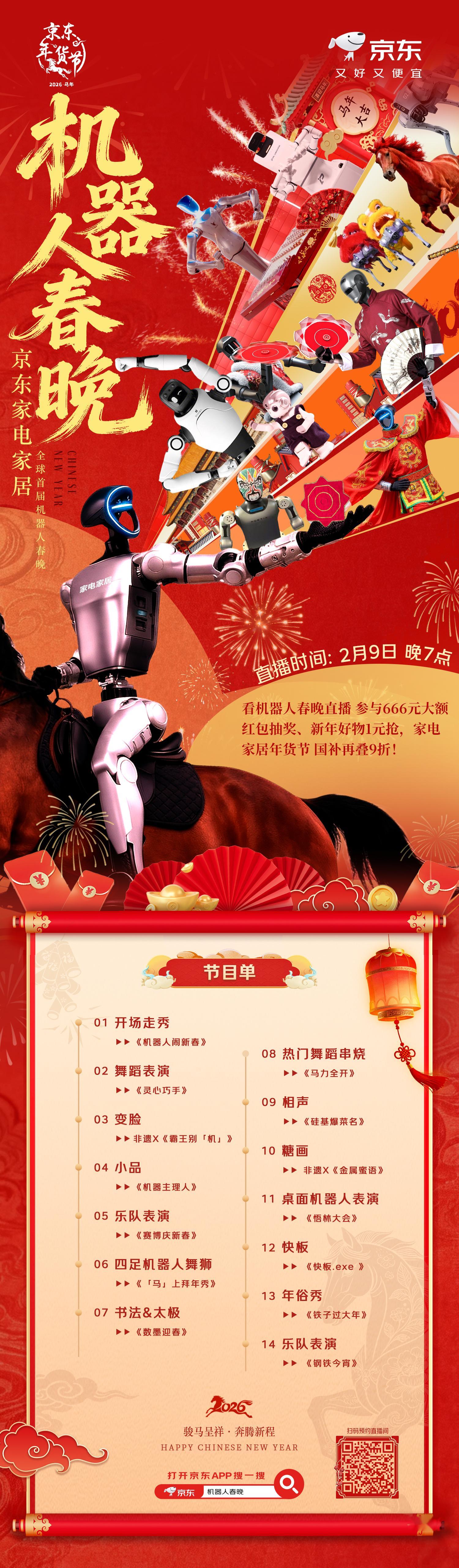 讲真,看到《钢铁今宵》乐队表演,我觉得这年味儿瞬间硬核了🎸!今年京东太卷了,2月9日小年前夜8点,连补3天,小年买年货来京东,2026元补贴人人可领。更绝的是还要办晚会,上京东搜【机器人春晚】预约2月9日晚7点直播,0元抽机器人试用,666元大红包等你拿。家电家居国补再叠9折,手慢无啊兄弟们!【网页链接】 小年上京东买年货领2026元补贴 京东买年货 又好又便宜 全球首届机器人春晚在京东年货节