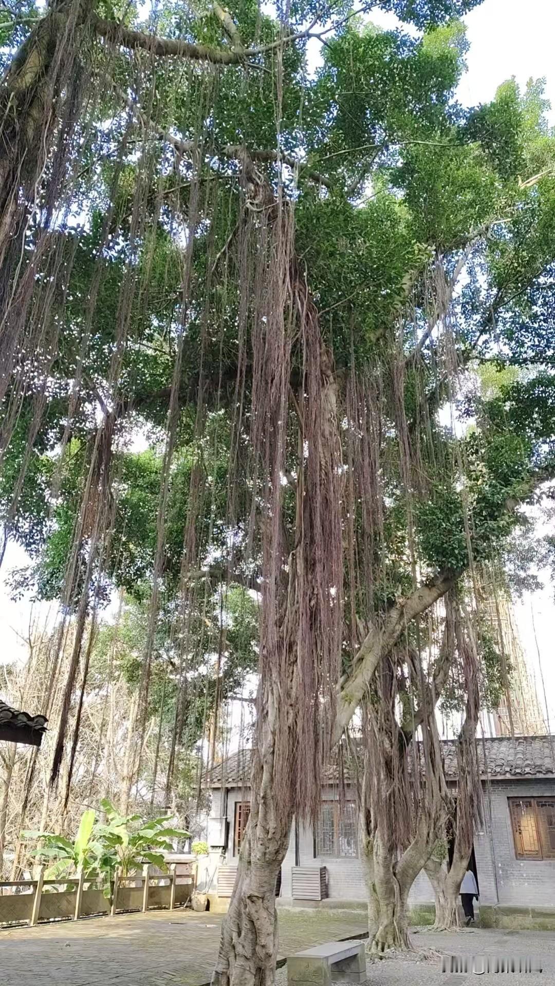 你看这几棵大榕树,长得可真有气势! 满树挂着的“长胡子”其实是它的气根,一条条垂下来,像老爷爷的胡须一样,特别有年代感。 它们的树干粗壮,枝繁叶茂,把整个院子都罩在一片浓绿里。旁边的青瓦老房子和石板路,和这几棵老树凑在一起,就像一幅慢悠悠的旧时光画卷,让人忍不住想在石凳上坐一会儿,吹吹风,听听树叶沙沙响。