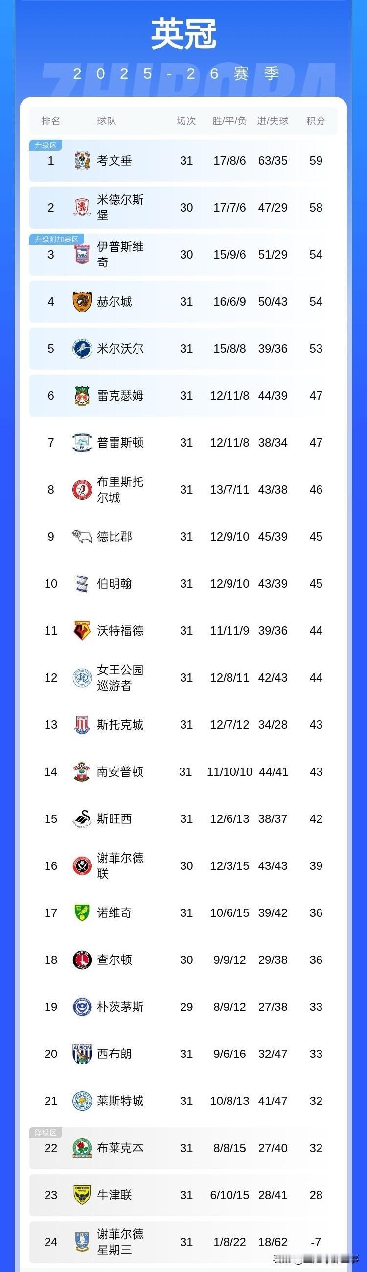 英冠最新积分榜:考文垂3轮不胜,多赛一轮领先优势只有1分;米德尔斯堡只要战胜谢菲尔德联就可以登顶榜首;伊普斯维奇、赫尔城、米尔沃尔和雷克瑟姆身居附加赛区,分列第3到第6位;莱斯特城因为财务问题被扣6分,已经濒临降级区;谢周三至今只取胜1场,赛季结束也很难是正分了!