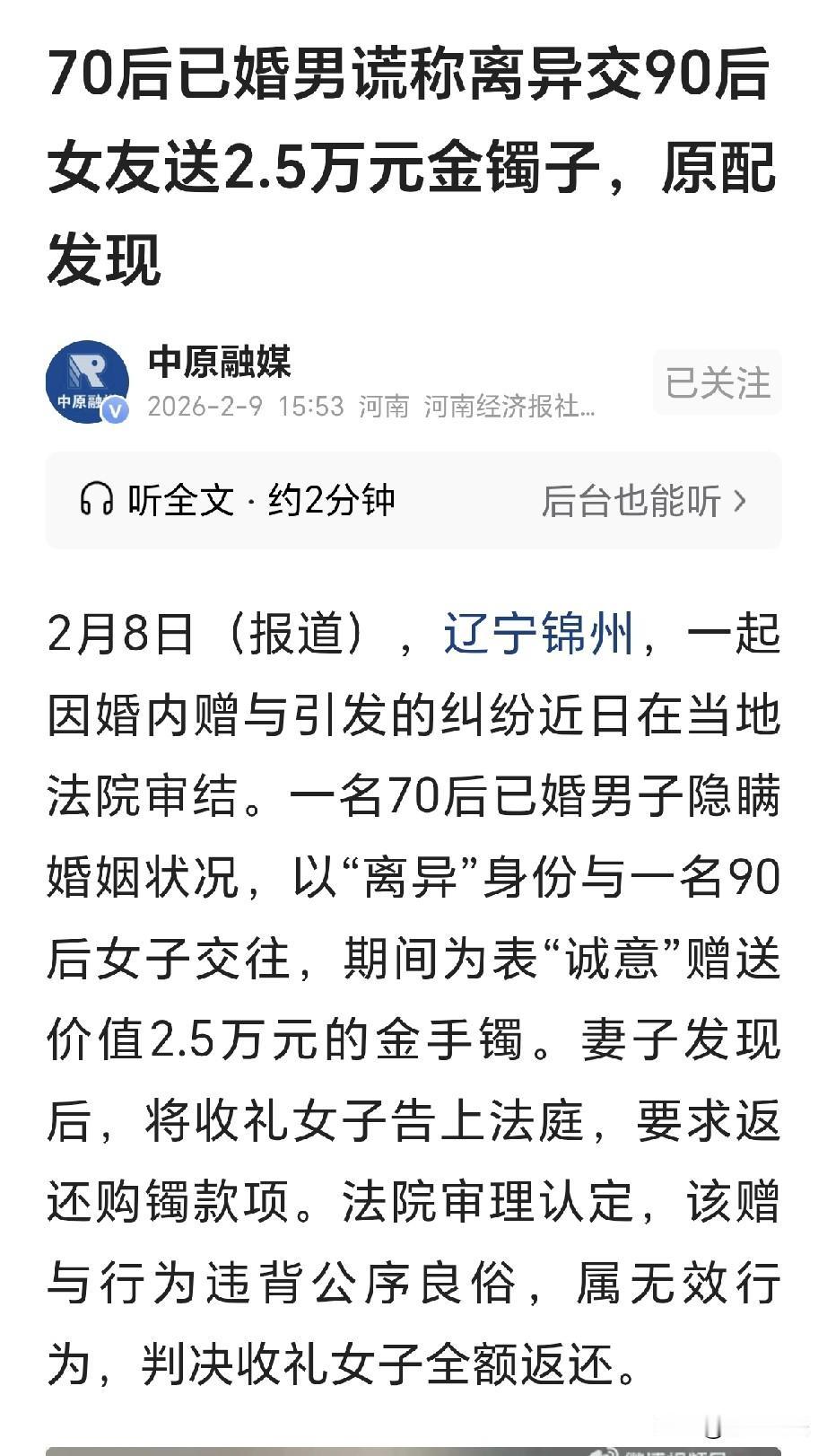 “白 P 了!”辽宁锦州,一70后男子自称离异,哄骗90后女牌友和他发生了关系,他一时高兴,花25000元给女牌友买了个大金镯子,谁知没过几天,就被他妻子发现,妻子找女牌友要她归还,女牌友这才知道被男子骗了,女牌友提出,只还一半给妻子,因为自己也是受害者,妻子告上法庭,要求女牌友全部返还,男子跳了出来: 我媳妇儿要,我就往回要,我支持我媳妇! 周某年纪轻轻,她还是个单身,可是她闲来无事,总是爱去棋牌室打一会儿麻将。 棋牌室烟雾缭绕,男多女少,大多数都是老头老太太,他们退休之后,有大把的时间在这里休闲娱乐。 而周某坐在牌桌上,更是独树一帜,显得她年轻美丽,在一群人里特别的靓丽。 王某已经50岁左右,他70后生人,也不太小,也不太老,反而他身上,充满着成熟的味道。 他盯着周某,觉的周某年轻漂亮,他动了心思,想方设法和周某接近。 他谎称自己是离异,孩子大了,不用他管,他独身一人,一个人吃饱全家不饿。 他看见周某,顿时就眼睛放光,他故意给周某放牌,很快就获得了周某的好感。 周某看他年届中年,做事稳重,几圈牌下来,周某心里也泛起了涟漪。 牌局结束后,王某趁热打铁,和周某之间互相加上了V信,从那以后,两人天天热聊,没过多久,俩人就发生了愉快的关系。 从此以后,俩人确定了恋爱关系,王某为了表达诚意,决定送她一份贵重的礼物。 2025年8月20日,俩人来到金店,金店里琳琅满目,各种各样美貌的首饰。 王某让周某随意的挑选,周某看上一款金灿灿的手镯。 这手镯造型精美,在灯光下闪烁着耀眼的光芒。 周某直接带在了手上,幸福之情,无以表达。 王某去刷款,毫不犹豫刷了25012元,手镯戴在了周某的腕上,更加衬得她格外美丽。 谁知没过几天,周某接到一个电话。电话那头,是王某的妻子翟某。 翟某声嘶力竭,直骂周某不是个东西,勾y他她家男人,破坏他们的婚姻。 周某被骂的莫名奇妙,她这才知道自己是被王某给骗了。 王某根本就没离婚,翟某才是他合法的妻子。 他们之间有了矛盾,最近一直处在分居状态,可是矛盾过后,他俩和好如初,翟某翻他手机,这才发现他给金店支付了两万多元。 经过翟某的刨根问底,最终王某承认了买金镯子之事,翟某气的火冒三丈,结婚这么多年也没见你给我买过一件像样的首饰! 妻子在电话里愤怒吼道,你赶紧把王某送你的金镯子还回来,他是有老婆的人! 周某顿时就泪流满面,她没有想到,王某装的是如此的真诚,他信誓旦旦说自己是个离异人士。 原来全部都是谎言,自己在不知情下竟然成了不光彩的人。 她转而一想,自己并不是故意和王某交往,自己没错,错在王某,自己也是被他骗了。 周某认为,我也是受害者,我并不知王某有妻子,如果我把金镯子还了,那我受的伤害又该谁赔? 翟某看她不还,一纸诉状告到了法院,要求周某返还他们夫妻共同财产。 而那个始作俑者王某跳了出来,他在法庭上大叫: 买镯子用的是我们夫妻共同财产,我媳妇要,我就往回要,我支持我媳妇! 有人认为,是王某太不地道,周某属于不知情方,也是受害方,她没有任何违法行为,违法的一方属于王某,这个过错如果由周某承担的话,是不是有失公允? 也有人说,既然是夫妻共同可支配财产,那么男的把自己可支配的一半赠与了周某,周某只需把属于翟某的另一半返还就可以了! 那么,这件事在法律上是怎么认定的呢? 《民法典》第1062条规定,夫妻对共同财产,有平等的处理权。 王某花25012元给周某买金镯子,这笔钱属于王某和翟某夫妻共同财产。 王某未经翟某同意,擅自将大额共同财产赠与他人,并非用于家庭日常生活需要,侵犯了翟某对共同财产的平等处分权。 即使周某不知道王某有妻子,但也无法改变王某无权处分的事实。 共同财产受侵害的一方有权追回全部款项。 《民法典》第153条规定,违背公序良俗的民事法律行为无效。 王某隐瞒自己已婚的事实,与周某交往并给她买金镯子,建立在违反夫妻忠实义务的基础上,严重违背了公序良俗。 周某虽然自称也是受害者,但公序良俗的认定并不取决于受赠人是否知情。 只要赠与目的违反道德准则,就自始无效,因此周某负有全额返还款项的义务。 最终法院判决,周某将25000元全部返还给翟某。 所以,女士们一定要擦亮眼睛,一定分辨出对方说的是否是谎言,否则身心受到伤害,还会被仅退款。 对此,你怎么看?