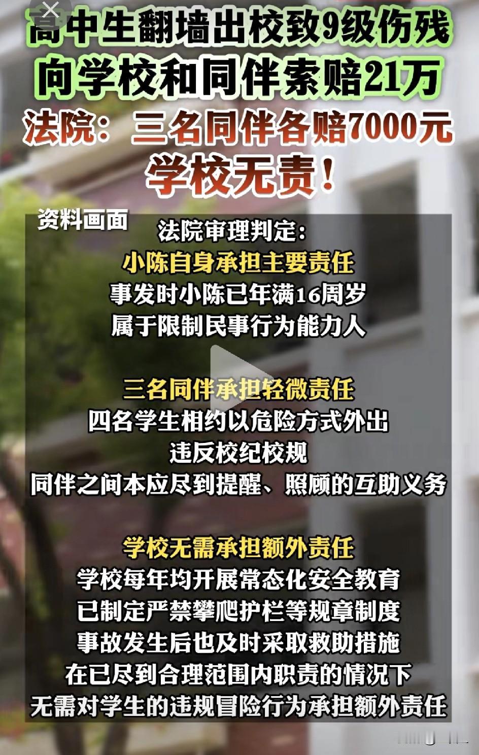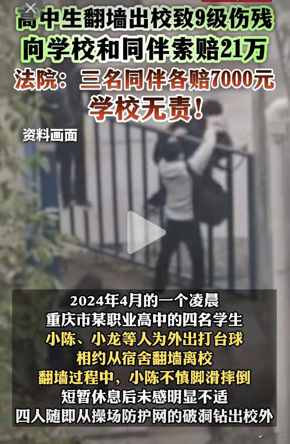 16岁高中生凌晨翻墙离校打台球,摔成九级伤残!法院判了:同伴赔钱,学校免责!网友:判的好! 凌晨翻墙、偷偷离校,这个看似“青春叛逆”的举动,却让重庆一名16岁的职高学生付出了沉重代价——九级伤残,21万多元的损失。 事情发生在2024年4月的一个深夜,重庆市某职业高中的四名学生小陈、小龙等人都觉得宿舍太闷,一拍即合决定翻墙出校去打台球。 翻墙过程中,小陈脚下一滑摔倒在地。他当时觉得问题不大,短暂休息后就跟同伴一起从操场防护网的破洞钻了出去。四人玩到凌晨六点才返回宿舍。 但一回到宿舍,小陈的腰部开始剧烈疼痛。班主任得知情况后,立即安排两名老师和一位学生陪同他去医院。 诊断结果令人揪心——九级伤残。经计算,这次受伤造成的医疗费、后续治疗费、残疾赔偿金等各项损失共计21万余元。 于是,小陈将学校和他的三名同伴及他们的家长一起告上法庭,要求赔偿。 法庭上,法官抓住了一个核心问题:到底谁该为这次受伤负责? 法院认为: ❗️小陈自己负主要责任。 小陈16岁不小了,应该知道什么能做、什么不能做。违反校规冒险,后果要自己承担。 ❗️❗️三个同伴赔一点。 四个人一起违规外出,同伴之间应该互相提醒、互相照顾。小龙等三人在小陈摔倒后,没有及时送医也没告诉学校,有一定责任。但因为小陈摔倒后还能继续出去玩,说明当时伤情不明显,所以三人责任不大,各赔7000元。 ❗️❗️❗️学校不用赔。 法院调查发现,学校每年都搞安全教育,明确禁止翻墙,出事后也及时送医,已经尽到了管理责任。学校责任不是无限的,不能为学生的每一个违规行为“兜底”。 最终,法院判决小龙等三人的监护人各赔偿7000元,驳回了小陈对学校的索赔请求。 这件事给所有青少年和家长提了个醒:校规不是摆设,安全不是儿戏。一时的“潇洒”可能换来一辈子的伤痛,而责任,最终还是要自己来扛。 网友热评: “16岁确实该懂事了,翻墙危险都不知道吗?” “学校冤啊,该做的都做了,总不能24小时盯着每个学生吧?” “朋友一起干坏事,出事了谁也跑不掉,这就是教训!” “21万的代价太沉重了,孩子们长点心吧!” “这次绝对支持该法院的判决:学校无责!” “你自己翻墙怎么好意思让朋友赔钱的,自己的苦果自己认!” “法律意识淡薄,维权意识很强!” “倒反天罡,我上学时翻墙逃学摔了还要被家长打一顿,还要被学校处罚!” 这件事你怎么看?你觉得责任划分合理吗?欢迎在评论区留言讨论! 素材来源:华商报,侵联删!