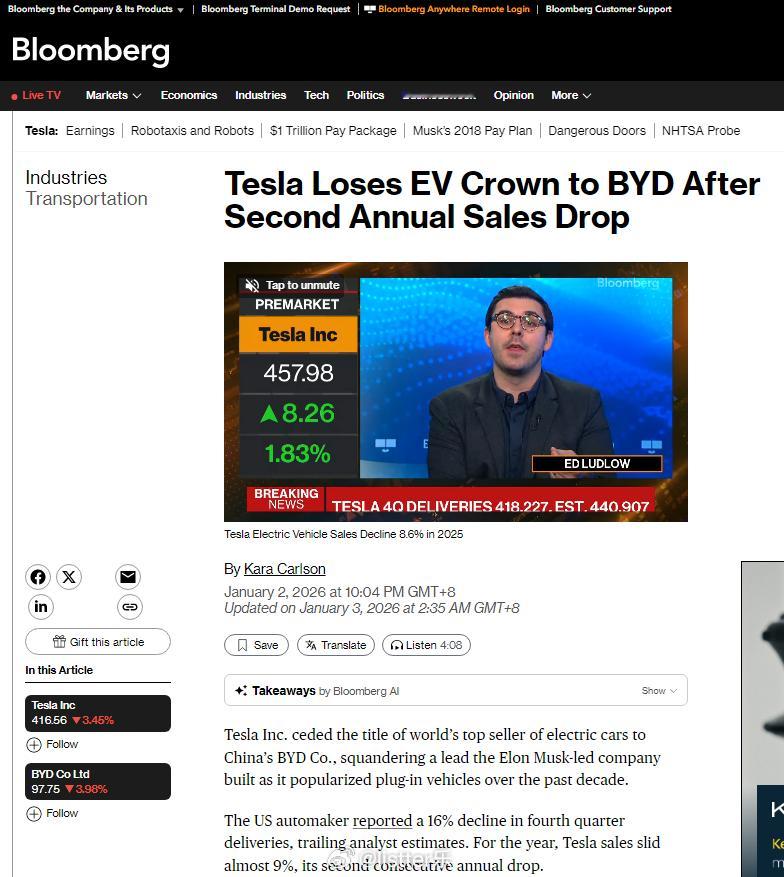 2025年,全球新能源汽车产业迎来历史性转折。长期在新能源汽车总销量上保持第一的比亚迪,以全年225.7万辆的纯电动汽车销量,首次超越特斯拉,新能源汽车行业新标杆登顶全球榜首。这一历史性超越,其背后是中国汽车品牌凭借体系化创新与战略性全球化,在全球汽车产业核心赛道实现引领的标志性事件。