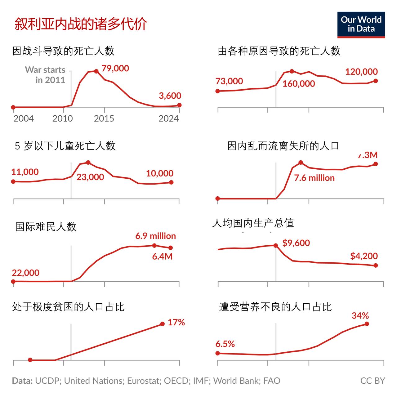 叙利亚内战的代价有多大? 已导致数十万人丧生,数百万人流离失所,并造成了严重的健康问题和广泛的贫困状况。 关于战争与和平的研究主要关注那些在战斗中直接丧生的人。但战争还有许多其他代价:它会损害人们的健康,使他们失去工作,并迫使他们离开家园。 下面图表展示了叙利亚内战的情况。自 2011 年战争爆发以来,已有超过 40 万人在战斗中丧生。与此同时,每年的死亡人数也有所增加,因为还有更多人死于其他原因。年幼的孩子受到的影响尤为严重:据估计,每年儿童死亡人数增加了两倍多。 这场战争还迫使数以百万计的人背井离乡:在叙利亚国内,总计有超过 700 万人流离失所,而在国外,又有几乎同样数量的人成为了难民。 这也使得人们谋生变得更加困难。以人均国内生产总值来衡量的平均生活水平,自战争爆发以来已经下降了一半以上。因此,贫困和饥饿问题也急剧加剧了。 注意这些数据存在不确定性,因为冲突使得收集数据变得困难且危险。 这表明,要了解战争的代价,我们需要有更广阔的视野,要看到战争对健康、人员流离失所以及生活水平等方面的影响。