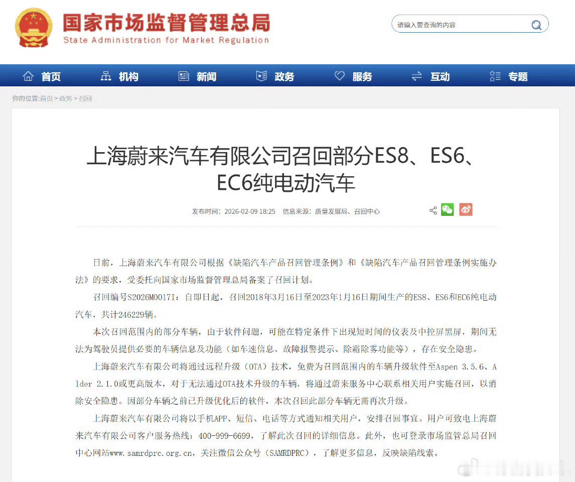蔚来备案OTA召回ES8、ES6、EC6车型,原因中控可能短时间黑屏而无法提供必要功能,看了下需要升级的软件版本号涉及的是一代车型。