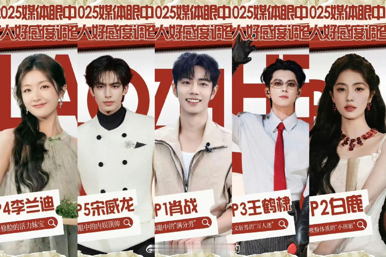 2025媒体好感度最高的五位艺人: 肖战宋威龙王鹤棣李兰迪白鹿