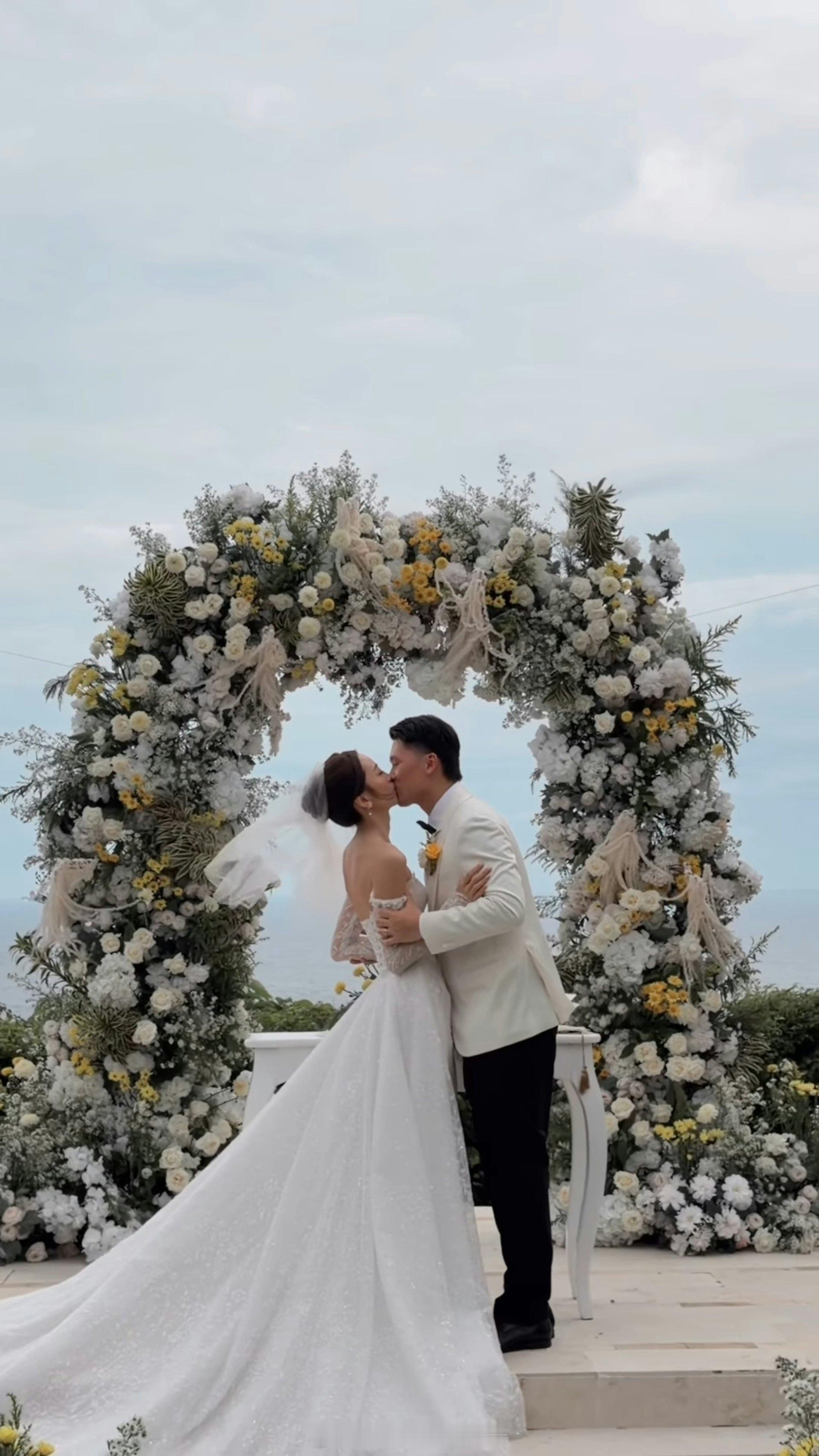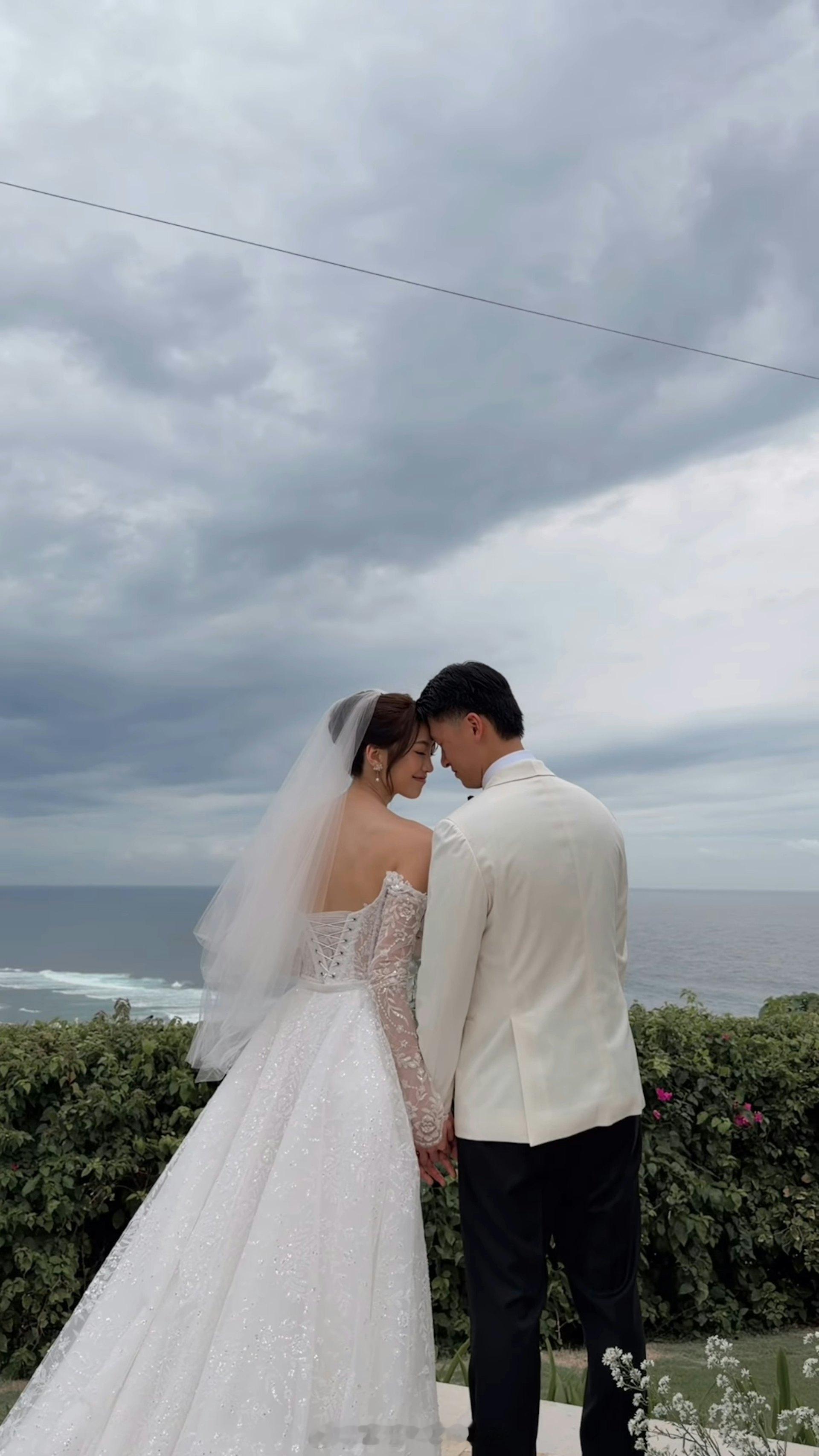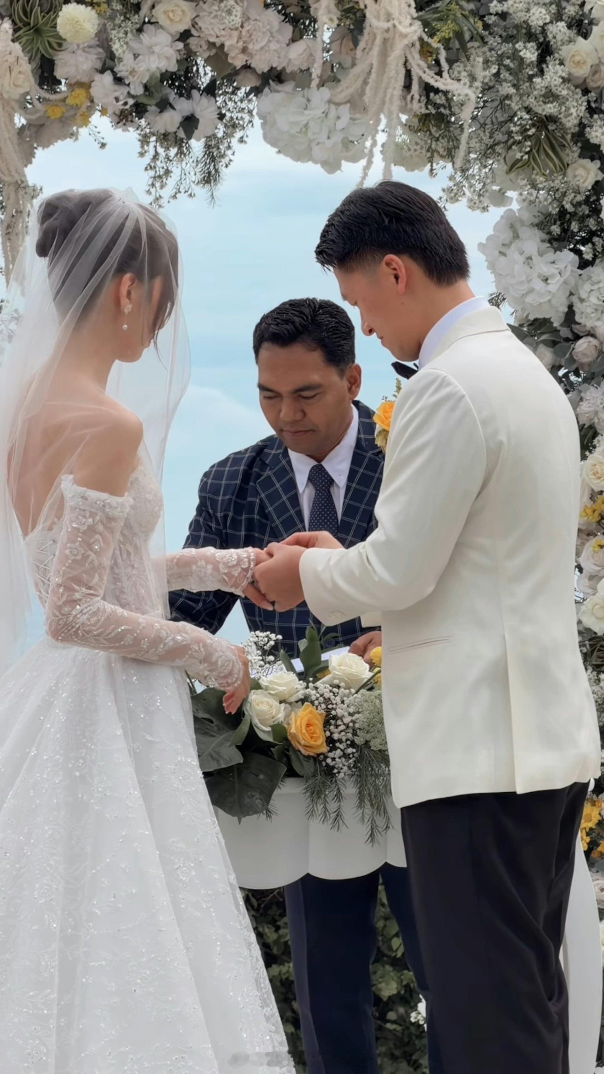 浪漫婚礼在完成中式仪式后,杨咏彤换上一袭设计简约优雅的白色低胸婚纱,展现其模特身材的高挑美态。在巴厘岛的蓝天白云与蔚蓝海岸映衬下,她与老公在海边的露天场地行礼。在一众亲友的见证与祝福声中,两人许下爱的誓言,画面唯美浪漫,获不少网民大赞是“郎才女貌”的完美搭配!