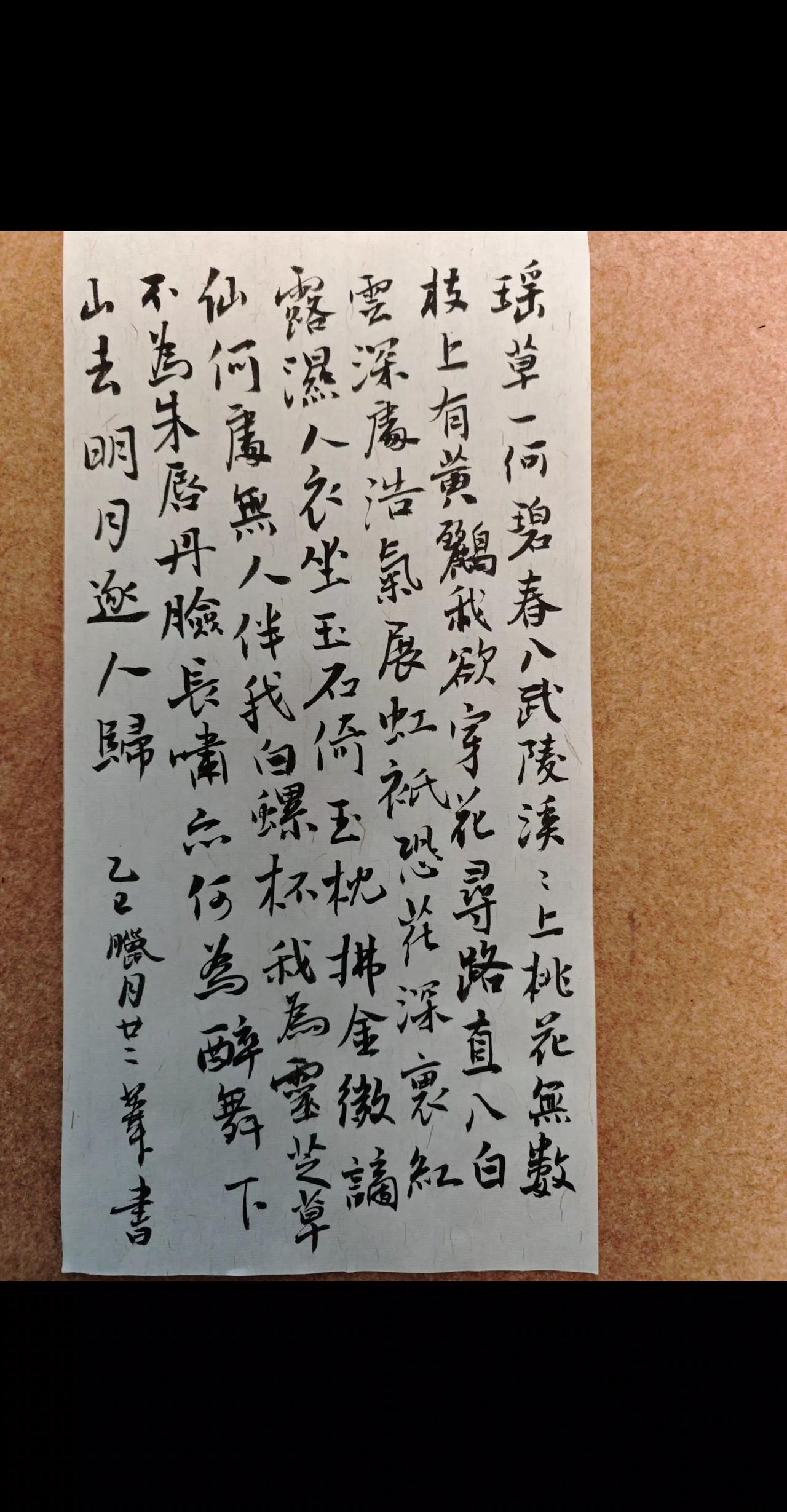 瑶草一何碧,春入武陵溪。溪上桃花无数,枝上有黄鹂。我欲穿花寻路,直入白云深处,浩气展虹霓。只恐花深里,红露湿人衣。 坐玉石,倚玉枕,拂金徽。谪仙何处?无人伴我白螺杯。我为灵芝仙草,不为朱唇丹脸,长啸亦何为?醉舞下山去,明月逐人归。 黄庭坚 书写 练字