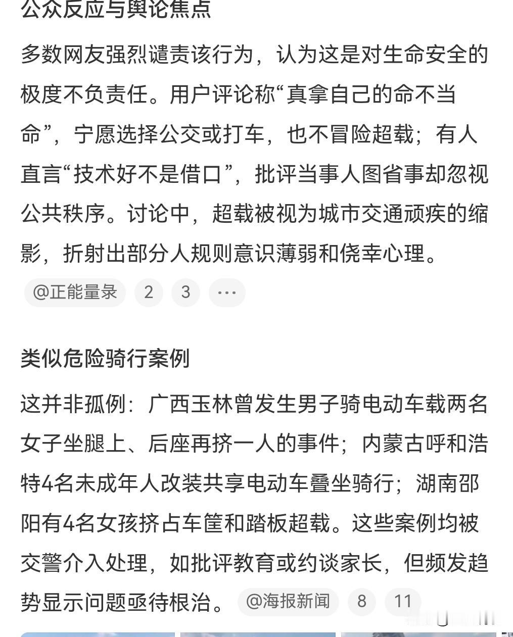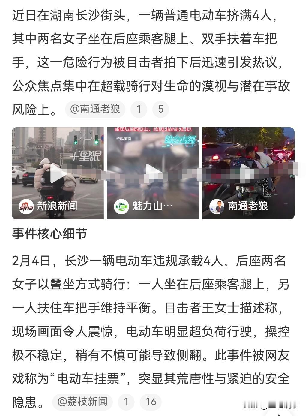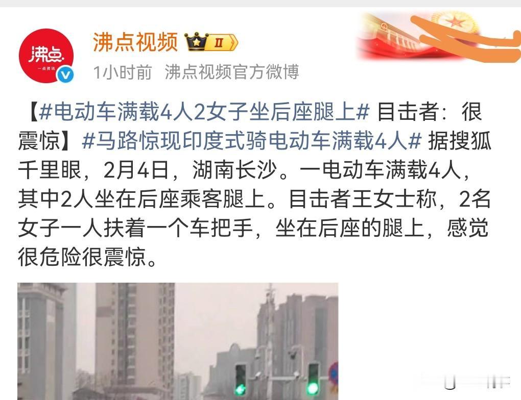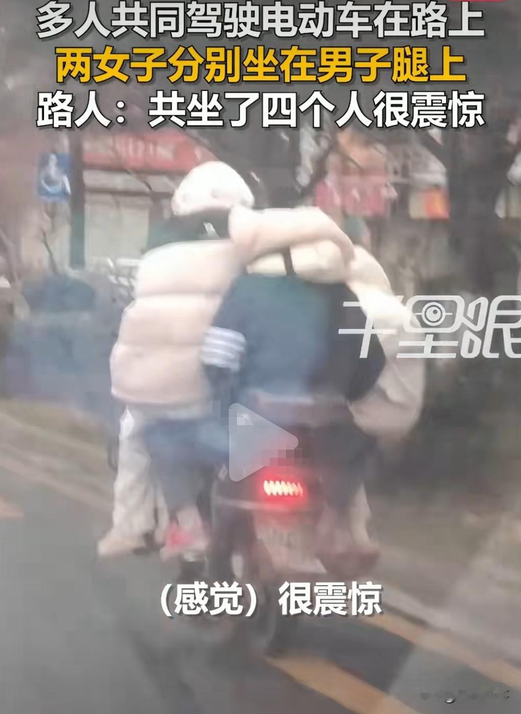 这也太离谱了,感觉又是精神小妹精神小伙才能干出的事情。 近日长沙,电动车满载4人,2女子坐后座乘客腿上,而且两名女生分别扶着车把手。 这真是太危险了。 但凡出点意外,那就是个悲伤的故事了。 希望这样的人早晚被交警查到,必须严惩。