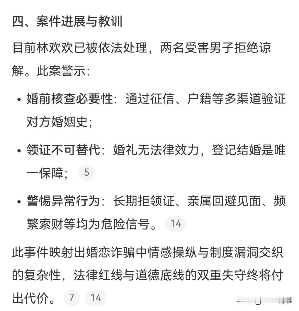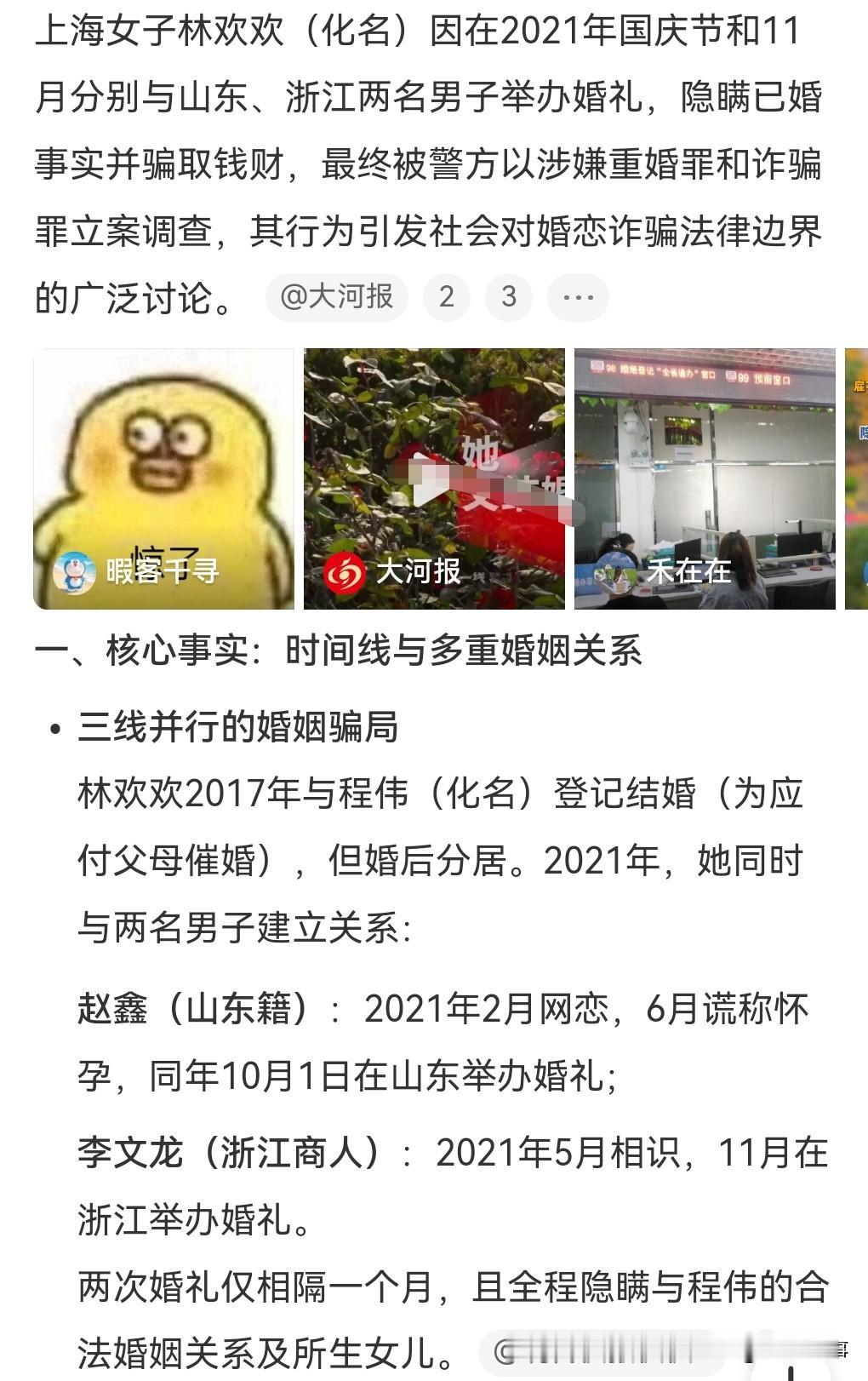 这年头骗婚骗彩礼骗感情的太多了,大龄单身男光棍要小心了呀。 2月9日热搜,2021年,上海女子1个月山东、浙江结婚2次。 之前,她还有一个老公,婚后分居,不过两人在2023年有了孩子。 这女的还请了演员来扮演家人,很典型的那就是骗彩礼呀。 女子被抓后辩称自己的行为仅仅是婚外情,殊不知其行为已经触犯了法律,涉嫌重婚和诈骗。 等待她的必将是法律的严惩。