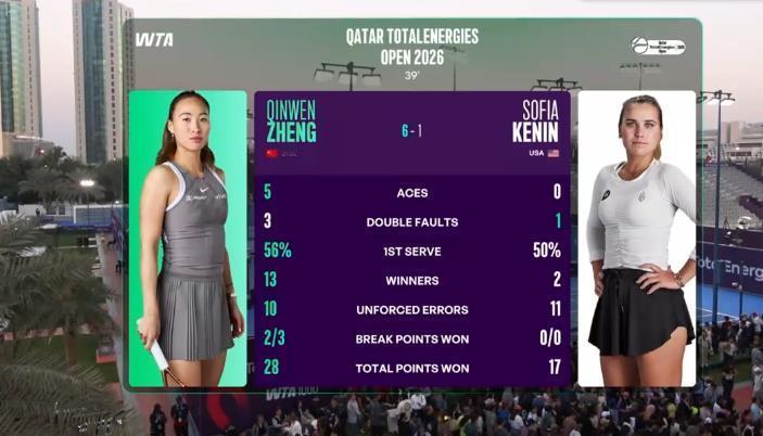 郑钦文4-6,6-1,6-2肯宁 迎复出首胜 多哈站首战告捷 此战对帕克斯