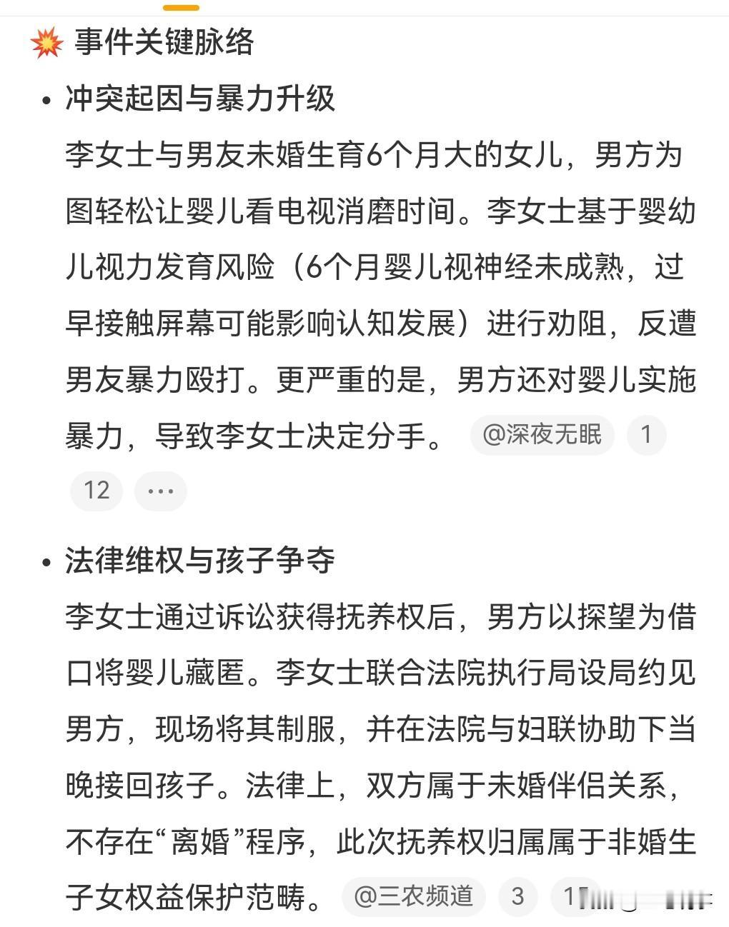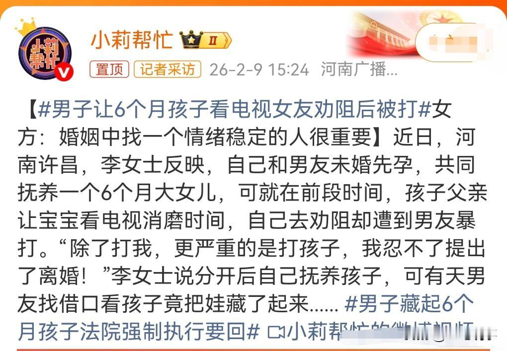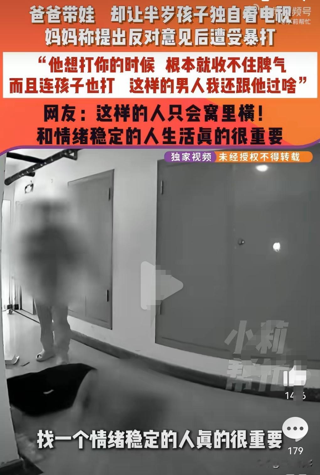 远离家暴男,不然有可能会性命不保。 近日河南许昌,李女士反映。 和男友未婚先孕,有个6个月大的女儿。 没想到这父亲非常的不称职,竟然让这么小的孩子看电视来消磨时光。 女子去劝阻却遭到了男友的殴打,打的老狠了,非常的暴力。 而且还打孩子,这么小的孩子都下得了手,作为一个父亲真的太失败。 女子对记者说打她可以忍,但是打孩子,那肯定不能忍,必须要分开。 我想说就算是打你,你也不应该忍啊,女性在面对家暴的时候,也不能妥协,一定要远离这样的男人。