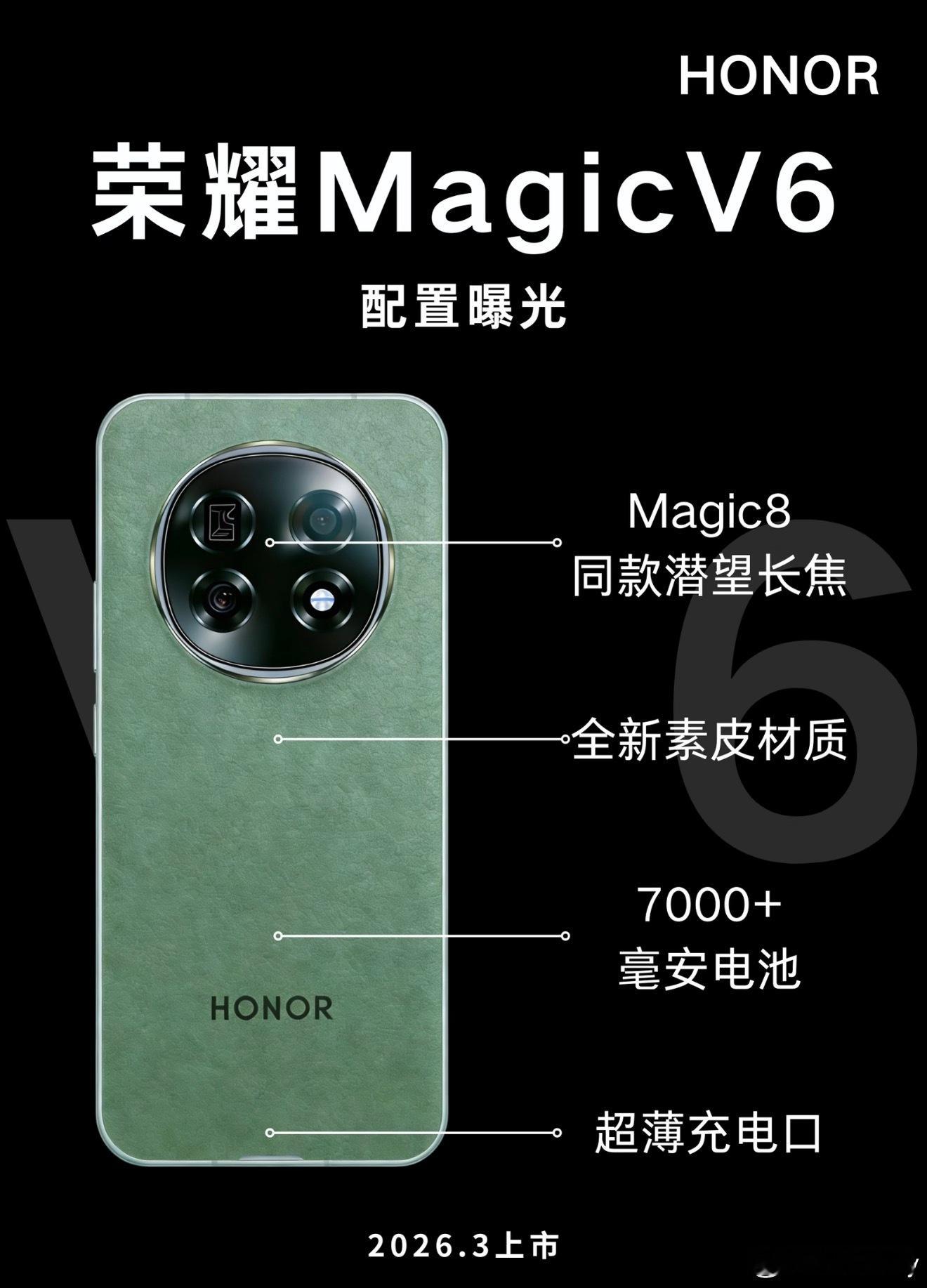 荣耀MagicV6马上来了这几天被荣耀MagicV6大折叠刷屏了!据说这次主要升级点是2亿像素主摄2亿潜望长焦和7150mAh大电池120W有线快充,而且加量不加价外观也更加复古,这款翡翠绿配色我很喜欢!期待MWC上的亮相🤩