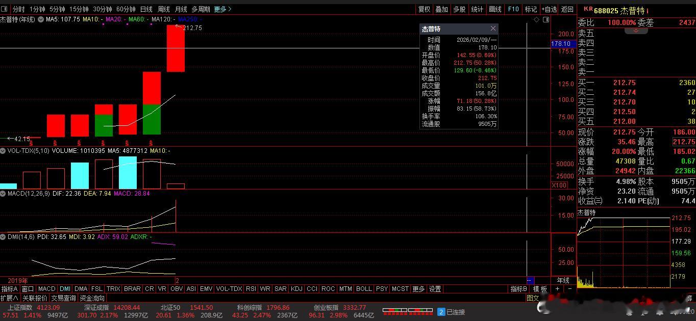 收盘价:212.75元。涨跌幅:20.00%。股票连涨:1天。