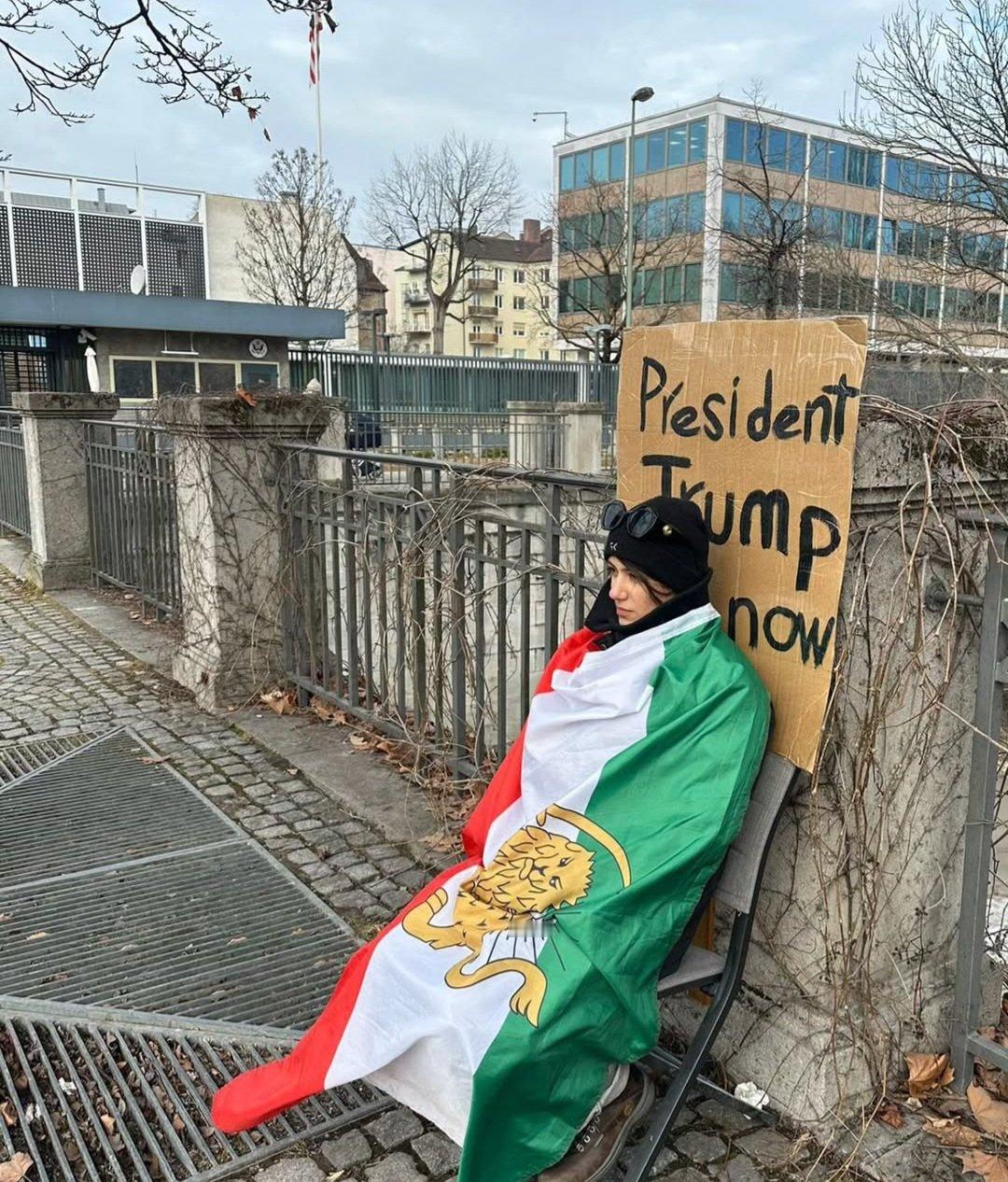 一位伊朗女性在慕尼黑美国领事馆前静坐,要求特朗普总统向伊朗人民提供援助。