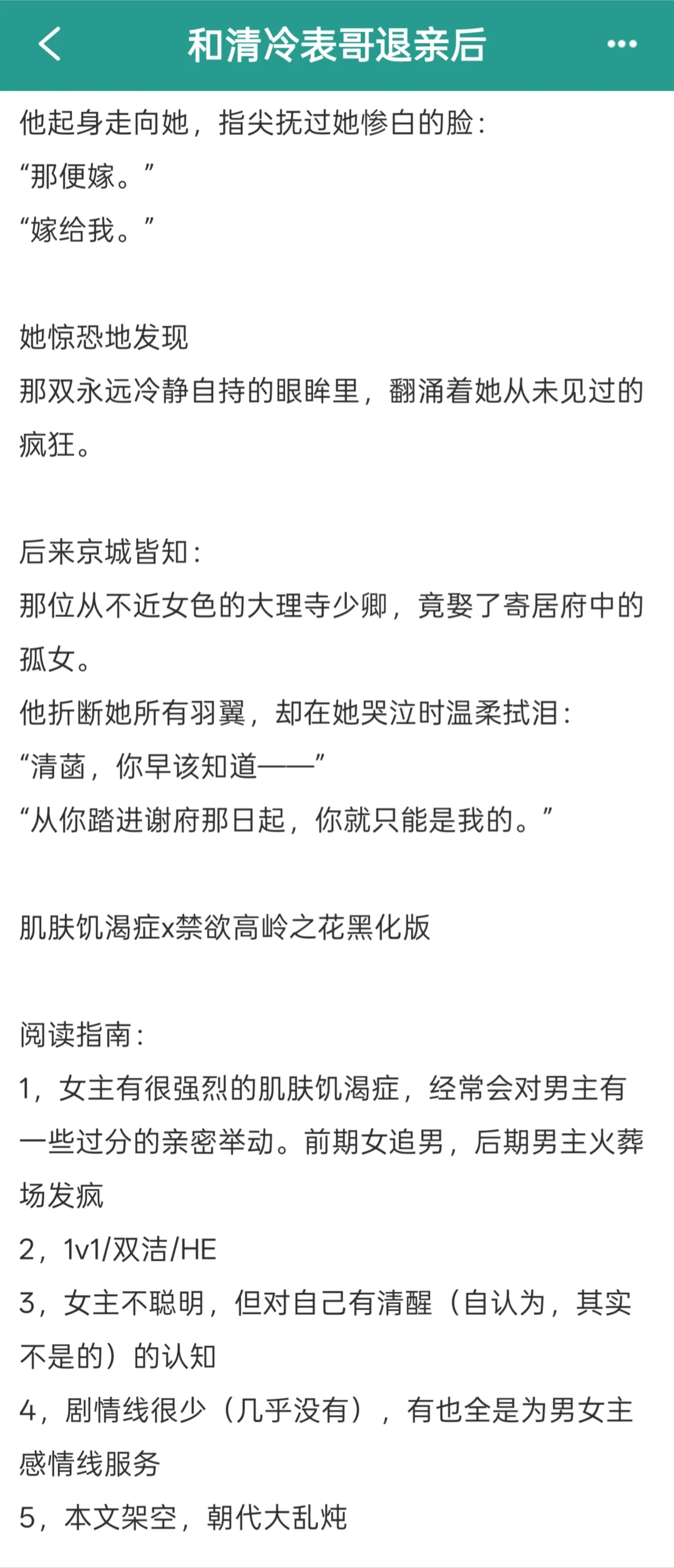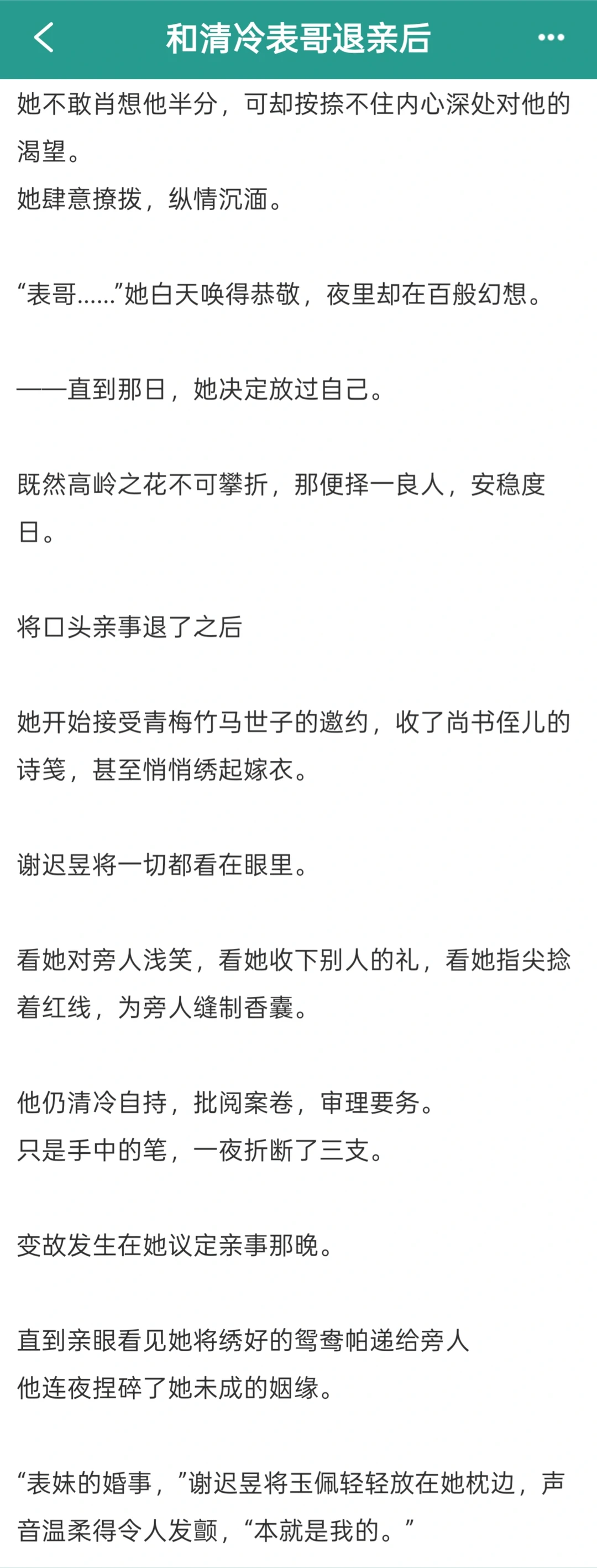 女主一直有意无意地撩拨端方清冷表哥,但一直不见回应,就在女主放弃他,打算投入他人怀抱时,高岭之花彻底被逼疯,直接对女主强取豪夺!