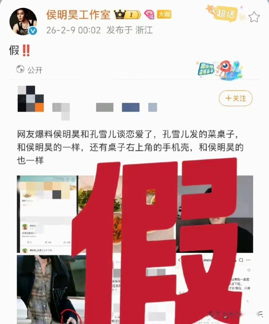 瓜刚热就凉!侯明昊孔雪儿恋情瓜光速翻车网传侯明昊孔雪儿恋爱,还扒出一堆所谓“同款证据”,热度刚起来就被狠狠打脸。凌晨双方工作室火速辟谣,侯明昊方直接一个“假”字硬刚,孔雪儿方也连发感叹号打假,直言两人无交集、纯属造谣。没有模棱两可,干脆利落破谣言,这波辟谣速度真的绝了才看到这瓜,假得也太离谱了吧!毫无实锤、全靠拼凑,一眼就能看穿是恶意造谣。侯明昊工作室凌晨火速辟谣,态度干脆又坚决。小猫哥本就是常年无休、连狗仔都认证的圈内工作狂,行程满到连休息时间都少,根本没空配合这些离谱编排。请别拿不实传闻打扰认真搞事业的人,拒绝造谣,尊重艺人专注工作的态度。