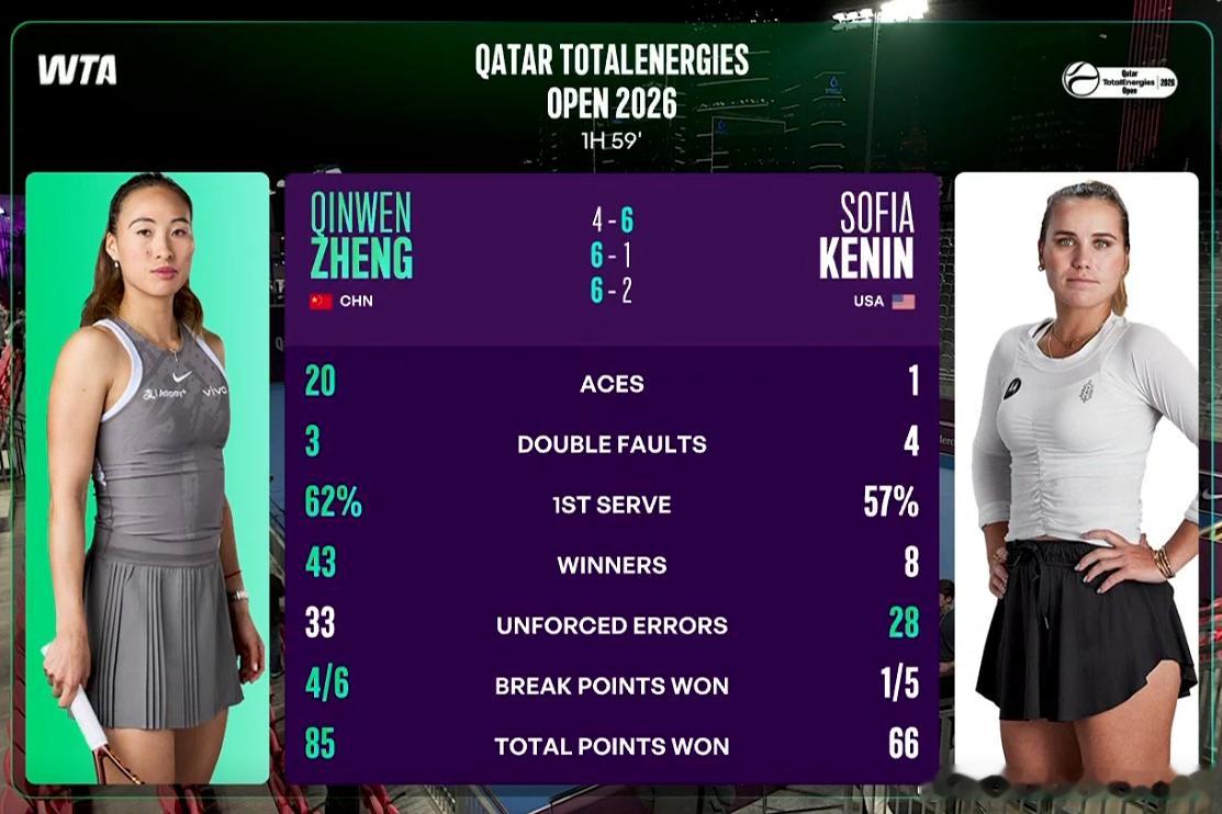 郑钦文今天获胜后各项主要比赛数据1发进球率: 62%1发得分率: 83%2发得分率: 48%ACE : 20 双误数 :3 制胜分 :43 非受迫失误 :33