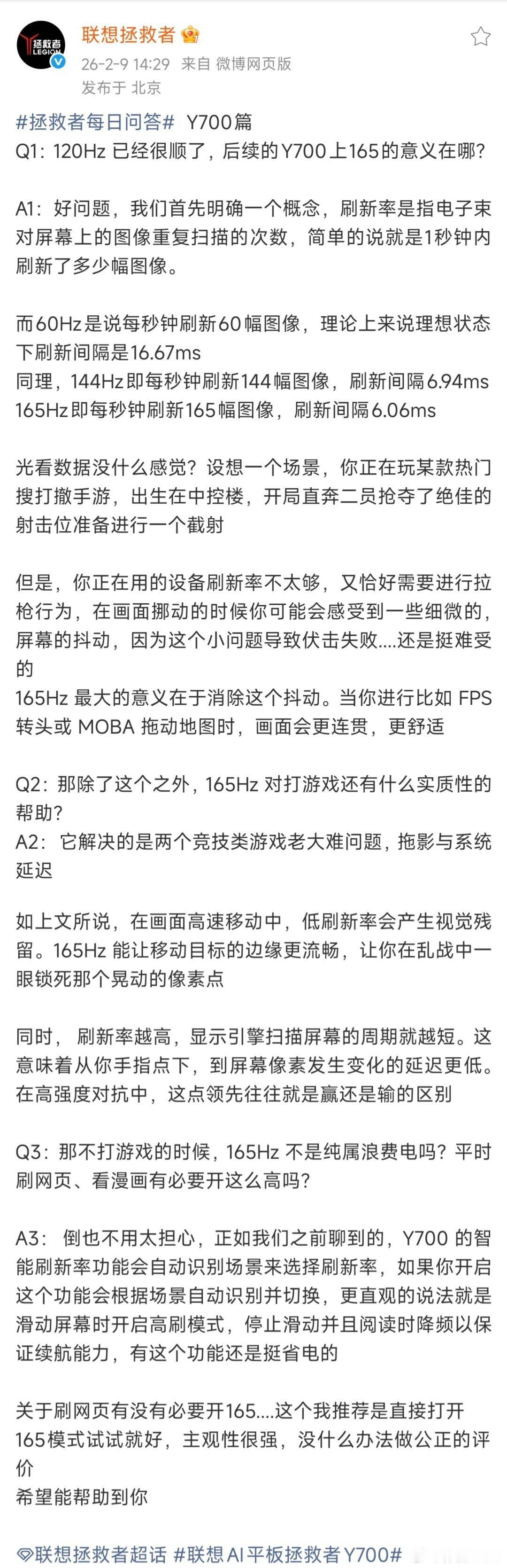 先别管165Hz适配咋样、用处多大,联想这篇把165Hz超高刷的意义讲清楚不少联想AI平板拯救者Y700