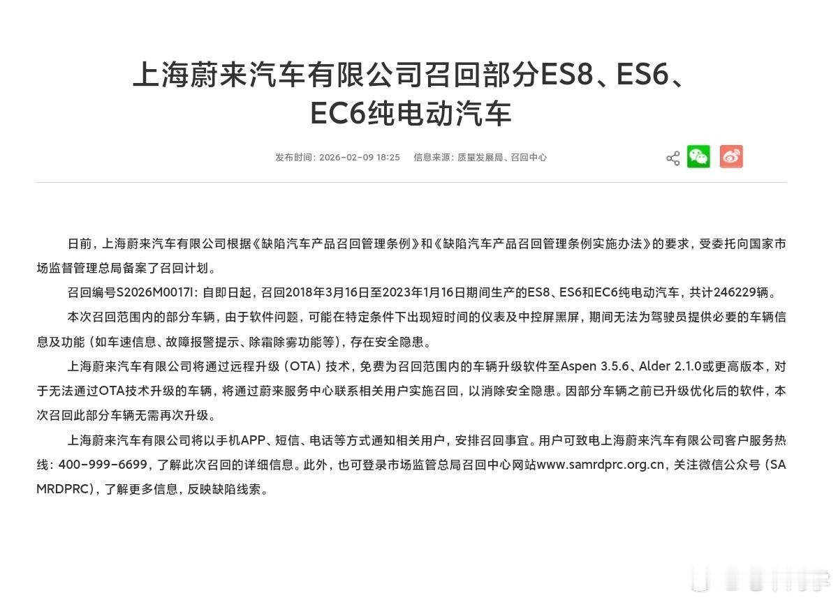 蔚来也召回了一部分ES8(非新款)、ES6、EC6纯电动,主要是18-23年生产的。