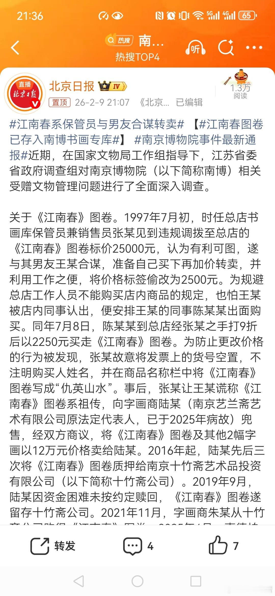 江南春系保管员与男友合谋转卖江南春系保管员与男友合谋转卖 【江南春图卷已存入南博书画专库】 南京博物院事件最新通报有人慷慨捐赠,有人监守自盗...举一反三!还应该彻查南博和其他博物院是否还有其他同类问题?来一次专项整治。 划重点:徐湖平还涉嫌其他严重违纪违法问题,目前正接受纪检监察机关纪律审查和监察调查。 这次调查真不容易,亡羊补牢未为晚也,要扎牢制度的牢笼,让人没办法做坏事。