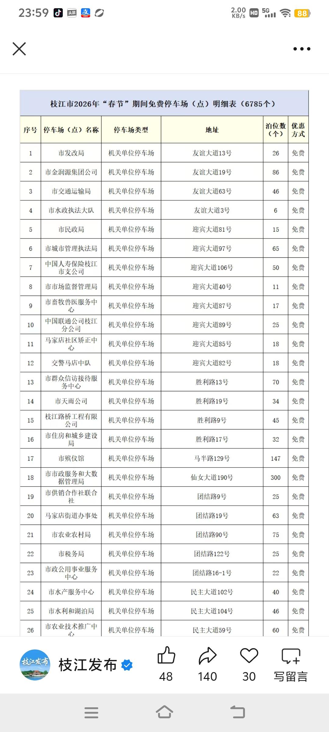 湖北枝江春节期间为民众免费提供6785个停车位。 春节期间,湖北枝江为了解决人们购物游玩及走亲访友停车的难题,枝江城区39处企事业单位内部停车场、27处金润源自营停车场,加上1297个道路临时停车泊位,共6785个停车位,全部让民众免费停车。 从2月15日零时开始,这些停车位民众就可以直接免费停车,一直到2月23日24时止。 由于人们现在出门下都是车辆出行,加上外地开车回来过年的,春节期间停车是人们出行的一大难题。现在湖北枝江免费提供停车位,必将极大的方便市民春节出行,为市民提供了一份暖心新春礼物。