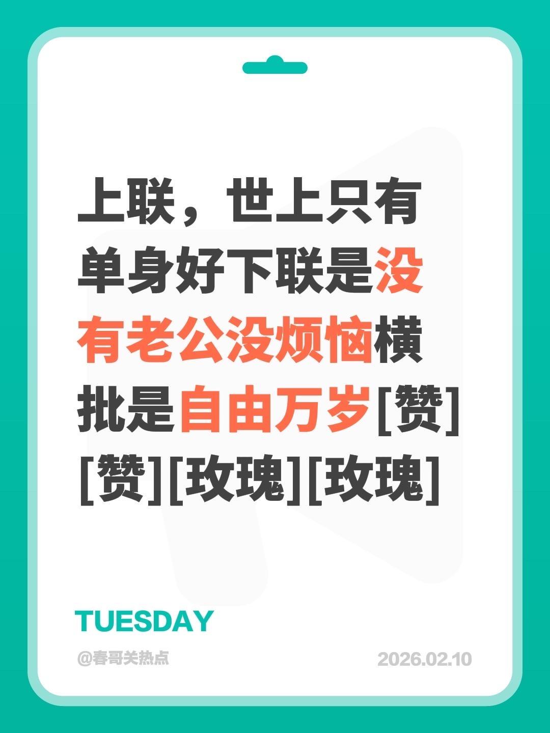 我评论了@瑶大婶苏姐 的作品: 上联,世上只有单身好下联是没有老公没烦恼横批是自由万岁[赞][赞][玫瑰][玫瑰]