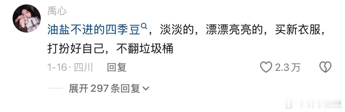 评论区刷到的,分享给你们🤲🏻🤲🏻🤲🏻做一个油盐不进的四季豆,淡淡的,漂漂亮亮的,买新衣服,打扮好自己,不翻垃圾桶。