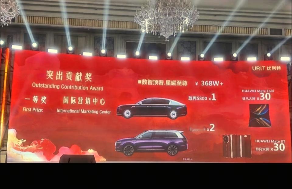 没想到广西还有这么豪横的年终奖,这家企业的年终奖,居然直接把尊界S800和华为全家桶端上来了。 去年,他们还曾用宾利奖励团队,今年直接换成华为系高端矩阵产品,趋势很明显,国产高端,正在成为顶级企业奖励的首选。 优利特这波年会,真的把“重奖团队”玩出了新高度。国际营销中心拿下突出贡献奖一等奖,奖品直接拉满:尊界S800、问界M9、华为 Mate Fold 非凡大师、Mate XT 非凡大师,总价值超368万,排面拉满。 所以,谁说国货拿不出手?我看拿到尊界年终奖的人都让网友们羡慕死了。 不过有意思的是,有尊界S800,问界M9只能排在奖品榜二的位置了。华为 尊界S800 华为尊界汽车