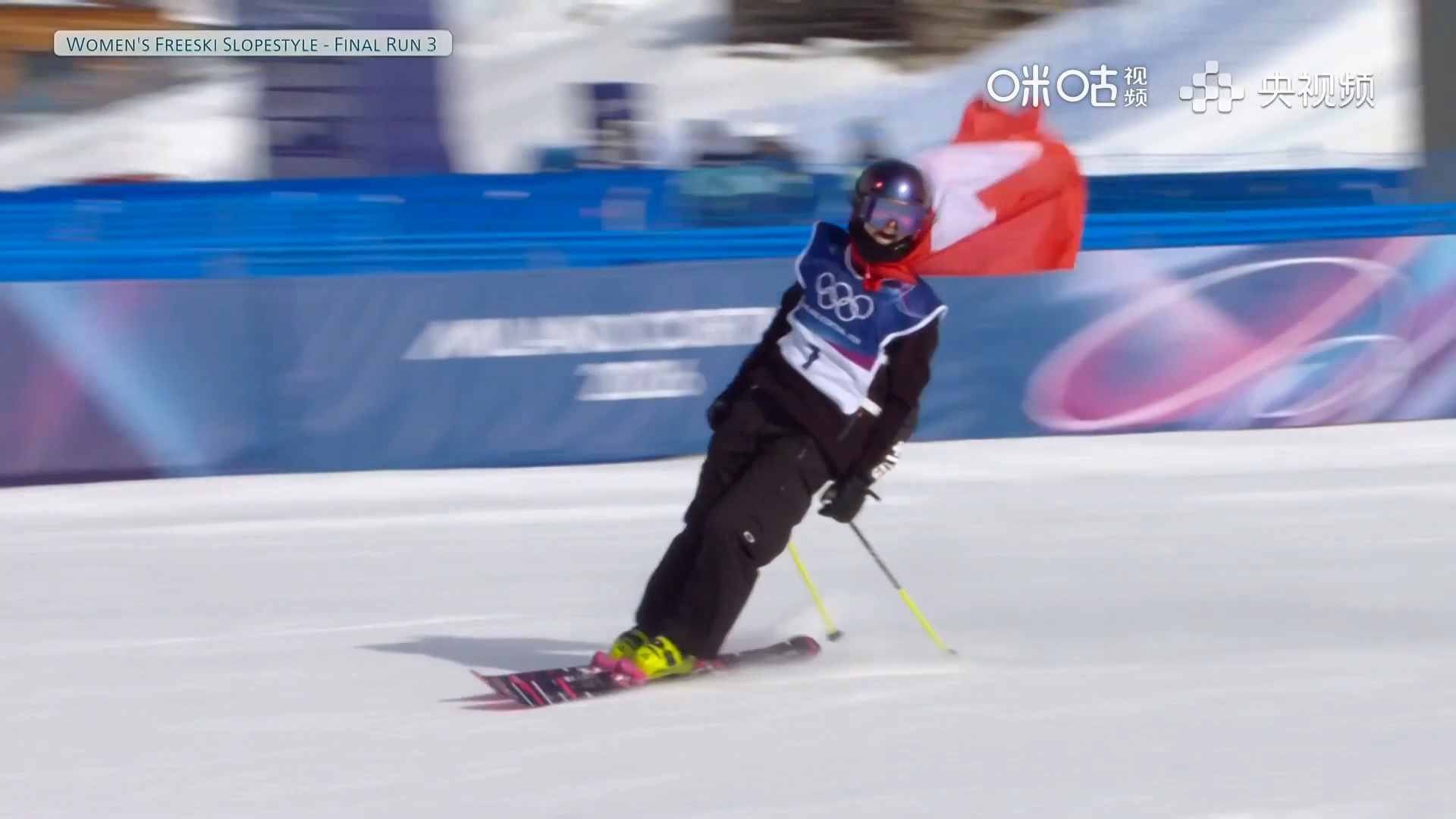 由于谷爱凌最后一跳遗憾摔倒,格雷莫德在最后一跳前已锁定冠军,她选择身披国旗庆祝自己的卫冕。