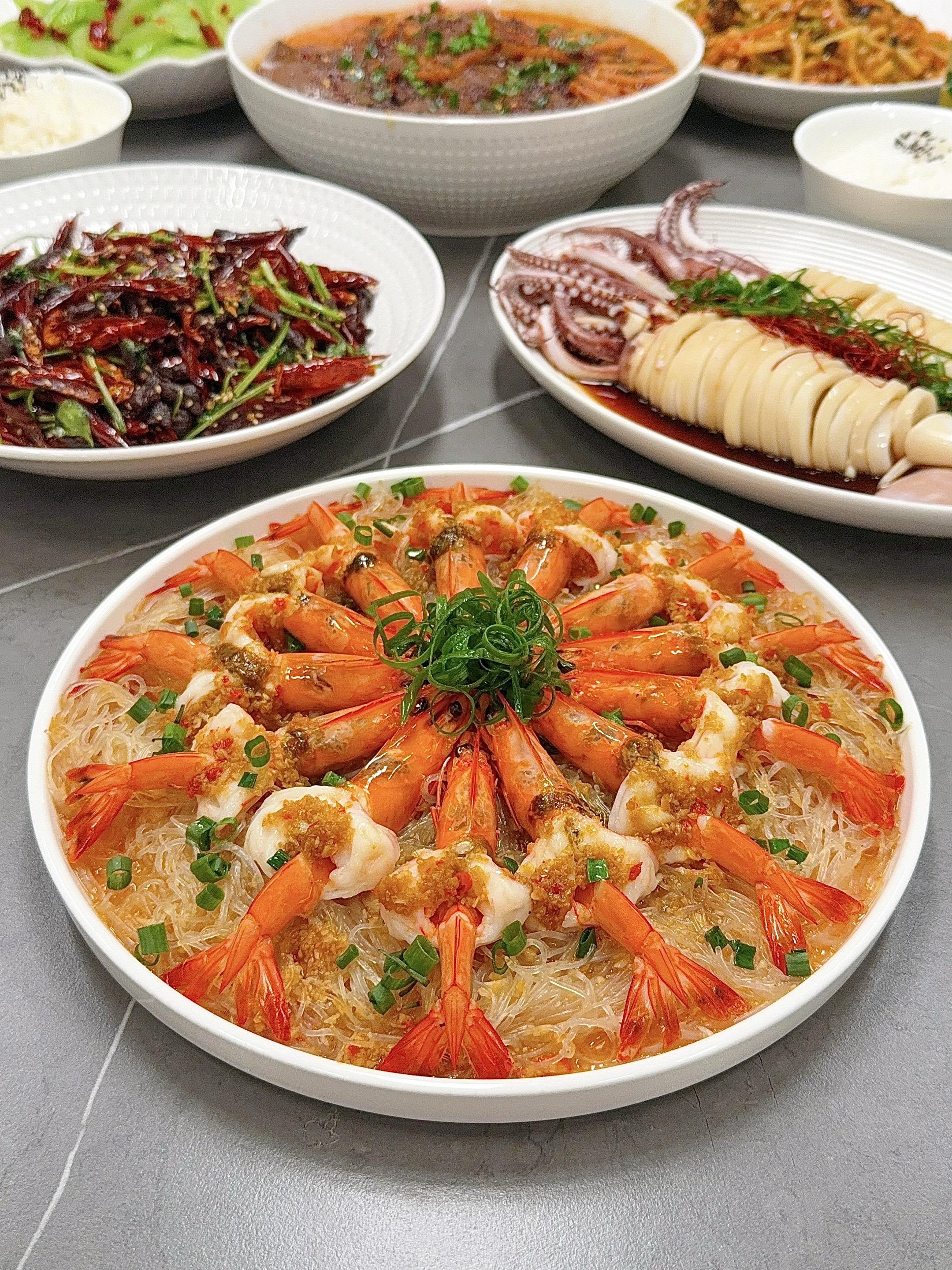 年夜饭灵感|举杯庆团圆,年味在舌尖。新年的氛围感,总是从一桌热气腾腾的饭菜开始蔓延的。 🧧新年家宴菜单分享: ❶【蒜蓉粉丝虾】 ❷【麻辣牛肉条】 ❸【白灼鱿鱼】 ❹【小鸡炖蘑菇】 ❺【毛血旺】 ❻【鱼香肉丝】 ❼【凉拌西芹】 🍒水果:草莓&车厘子