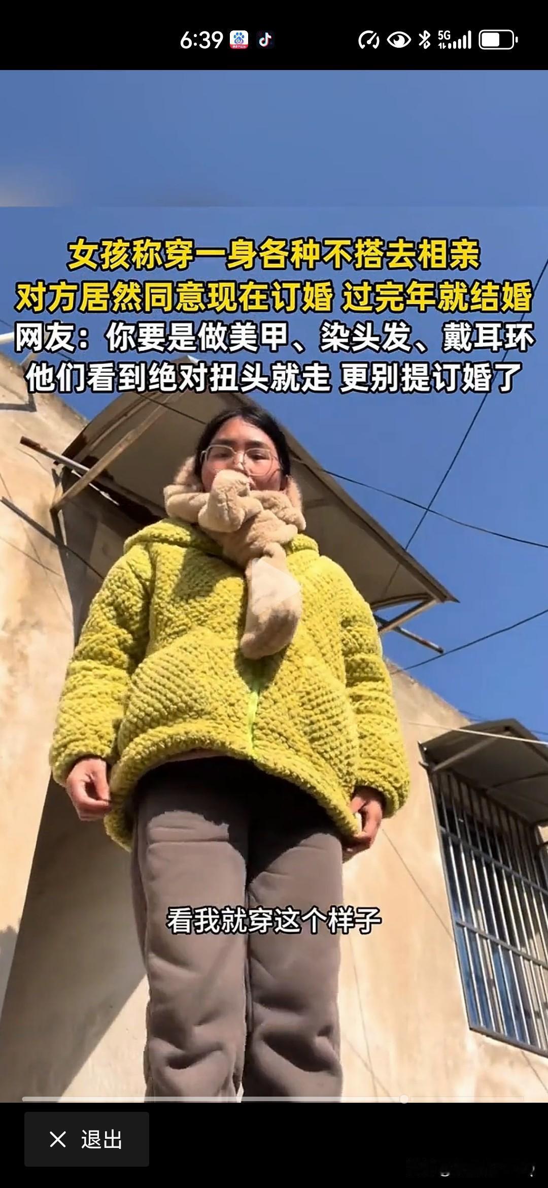 女孩称故意穿丑去相亲竟然被相中!在这个审美倒退年代,看看印度比伯居然是美男子,看看庞麦郎,华晨宇等是帅哥就知道后果,能够接受贾玲的肥胖,凤姐的獠牙,周冬雨的身板,何况你本来就很美,只是穿着稻草盖珍珠的模样,依稀可见里面女人之美的显山露水,而对方相亲有人对于女人好生养身材学,把本姑娘的屁股大好生娃一眼相中,所以彩礼9.9元包邮了!啊不是,是9.9万元!不会花里胡哨看似老实和会过日子的你。就这样沦陷了男方!爱的就是你,一起回去最低消费生娃五个!